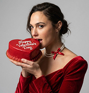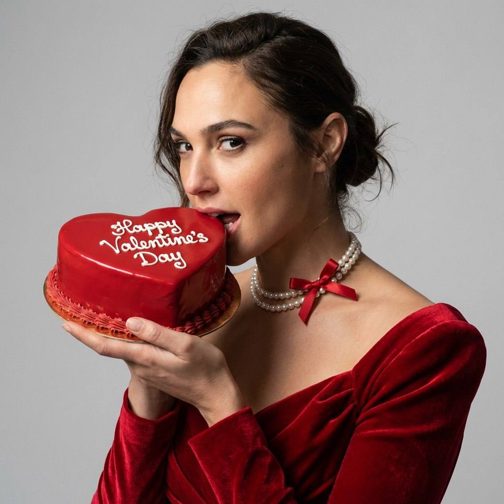 " СОХРАНИТЬ РЕАЛЬНОЕ ЛИЦО — строго сохранить точные черты лица и идентичность с референсного изображения. Без бьютификации, без стилизации. Фотография женщины, держащей торт в форме сердца с написанным на нём посланием. Она поднимает торт к лицу и слегка касается надкусывает его. Голова повернута на три четверти влево, она смотрит в камеру. Средний крупный план — от груди до головы, ракурс на уровне глаз с лёгким поворотом корпуса. Плотная композиция с акцентом на лице и торте — модель занимает большую часть кадра. Кожа естественная, без пластиковой ретуши. Волосы гладко зачёсаны назад и собраны в небрежный низкий пучок с волнистыми, выбившимися прядями у лица. На женщине насыщенно-красное бархатное платье с открытыми плечами и формованным корсетным лифом. Ткань плотная, мягко сотканная, с глубокими тенями в складках. На шее — двойная нить жемчуга, дополненная тонкой красной лентой, завязанной в аккуратный бант с длинными концами. В руках она держит торт в форме сердца, полностью покрытый гладкой красной глазурью, с декоративным бортиком по краю. На поверхности белой надписью, чёткой и контрастной, написано: «Happy Valentine’s Day». Фото сделано в студии на фоне светло-серой гладкой стены. Студийное освещение: мягкий направленный свет, основной источник расположен спереди и немного справа от камеры. На бархате формируются глубокие мягкие тени. Контраст умеренно высокий, тени имеют чёткий, но плавный край, фон освещён равномерно без затемнений. Снято на портретный объектив 85 мм с малой глубиной резкости: лицо и торт в резком фокусе, фон слегка размыт. Высокая детализация, фотореалистичность. Доминирующие насыщенные красные тона на фоне чистого светло-серого, высокая насыщенность с акцентом на красный спектр, средний или высокий контраст с глянцевыми бликами, чёткие, но мягкие тени. Негативный промт: деформированное лицо, изменённая внешность, искажённые черты лица, низкое качество, нереалистичная кожа, нереалистичная модель, нарисованное фото, нереалистичное фото"