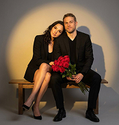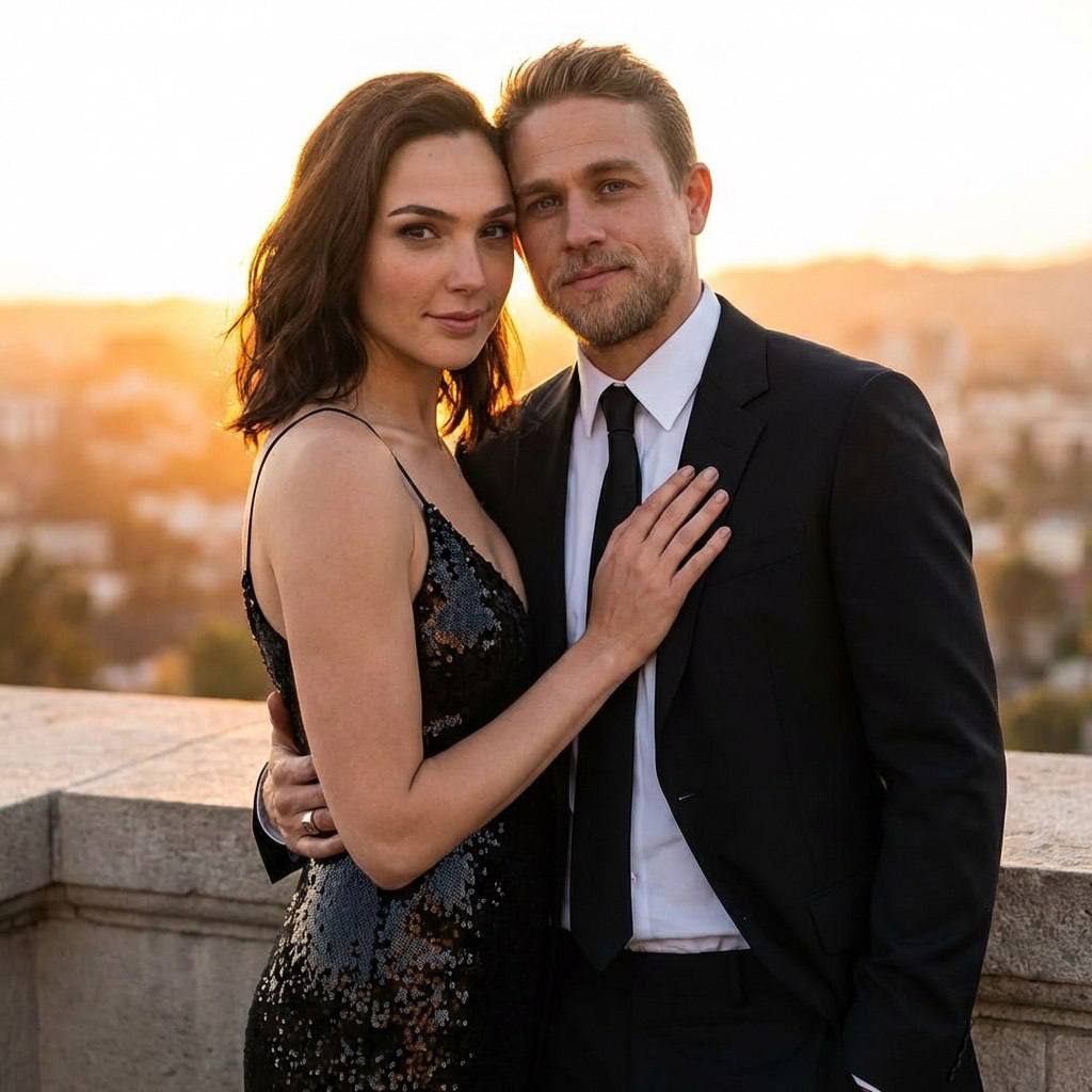 " СОХРАНИТЬ РЕАЛЬНЫЕ ЛИЦА — строго сохранить точные черты лиц и идентичность людей с референсного изображения. Без бьютификации, без стилизации. Мужчина и женщина стоят вплотную друг к другу на открытой террасе на фоне закатного неба и размытого городского пейзажа. Женщина слегка повернута к камере, её рука лежит на груди мужчины, вторая рука мужчины мягко обнимает её за талию. Их поза подчёркивает близость, доверие и романтическое напряжение. Мужчина слегка склоняет голову к женщине, его взгляд направлен в камеру. Атмосфера кадра — элегантная, чувственная и кинематографичная, с ощущением роскоши и вечернего свидания. Одежда: — на женщине длинное чёрное платье на тонких бретелях, расшитое блёстками, подчёркивающее фигуру; — на мужчине классический чёрный костюм с белой рубашкой и чёрным галстуком, образ строгий и утончённый. Фон — мягко размытый городской пейзаж в золотых оттенках заката. Небо тёплого янтарного цвета, создающее контраст с тёмной одеждой героев. Композиция вертикальная, герои занимают центр кадра. Кадр средний/поясной, акцент на их позе и эмоциях. Освещение — естественное закатное, тёплый контровой свет подсвечивает контуры волос и плеч, мягкий фронтальный свет подчёркивает кожу и детали одежды, без жёстких теней. Стиль изображения — реалистичный портрет, высокая детализация, мягкая глубина резкости, кинематографическая цветокоррекция, благородный контраст, без агрессивной ретуши. Негативный промт: искажённые лица, изменённая внешность, деформированные пропорции тела, неестественные позы, лишние конечности, размытые лица, пластмассовая кожа, сильная ретушь, мультяшный стиль, нарисованный стиль, шум, пересвет, потеря деталей, низкое качество, искажённая анатомия."