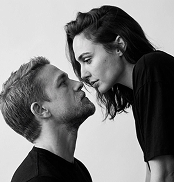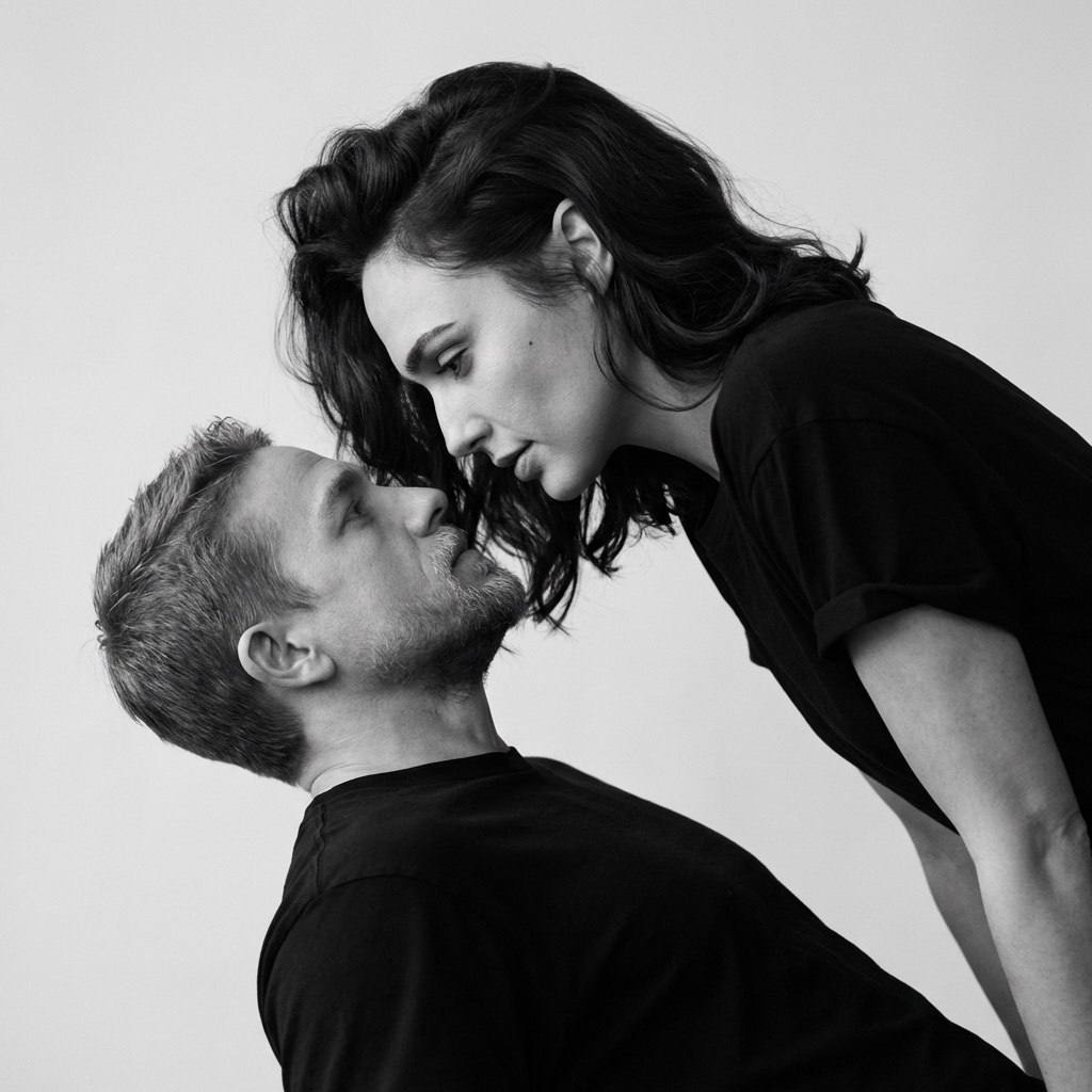 " СОХРАНИТЬ РЕАЛЬНЫЕ ЛИЦА — строго сохранить точные черты лиц и идентичность людей с референсного изображения. Без бьютификации, без стилизации. Фотография мужчины и женщины, стоящих очень близко друг к другу. Мужчина расположен ниже в кадре и смотрит вверх, в то время как женщина наклоняется к нему сверху; их взгляды направлены друг на друга, создавая визуальный контакт. Крупный план показывает лица в профиль, композиция выстроена по диагонали снизу вверх. Мужчина занимает нижнюю левую часть кадра, женщина — верхнюю правую, фон полностью нейтральный и пустой. Кожа женщины естественная, без пластиковой ретуши. Волосы женщины аккуратно уложены с объёмом у корней. Оба одеты в чёрные однотонные оверсайз-футболки. Ткань матовая. Съёмка выполнена в студии на фоне светлой, простой, гладкой стены без текстуры. Освещение — мягкий студийный свет с рассеянным источником, расположенным спереди и немного сверху. Свет равномерно формирует черты лица, создавая мягкие тени под подбородком и вдоль линии носа. Контраст умеренный, переходы между светом и тенью плавные, без жёстких границ, общий тон изображения — монохромный. Снято на портретный объектив 85 мм с малой глубиной резкости: лица в резком фокусе, фон полностью размыт и лишён деталей. Чёрно-белый портретный стиль, высокая детализация, фотореалистичность. Кинематографичное чёрно-белое настроение, нейтральная градация серого, средний общий контраст, мягкое рассеянное освещение, плавные переходы теней, сбалансированные светлые участки без пересветов, естественная передача текстуры кожи в монохроме, чистая мелкая зернистость, классическая монохромная цветокоррекция портрета. Негативный промт: деформированные лица, изменённая внешность, искажённые черты лиц, низкое качество, нереалистичная кожа, нереалистичные модели, нарисованное фото, нереалистичное фото."
