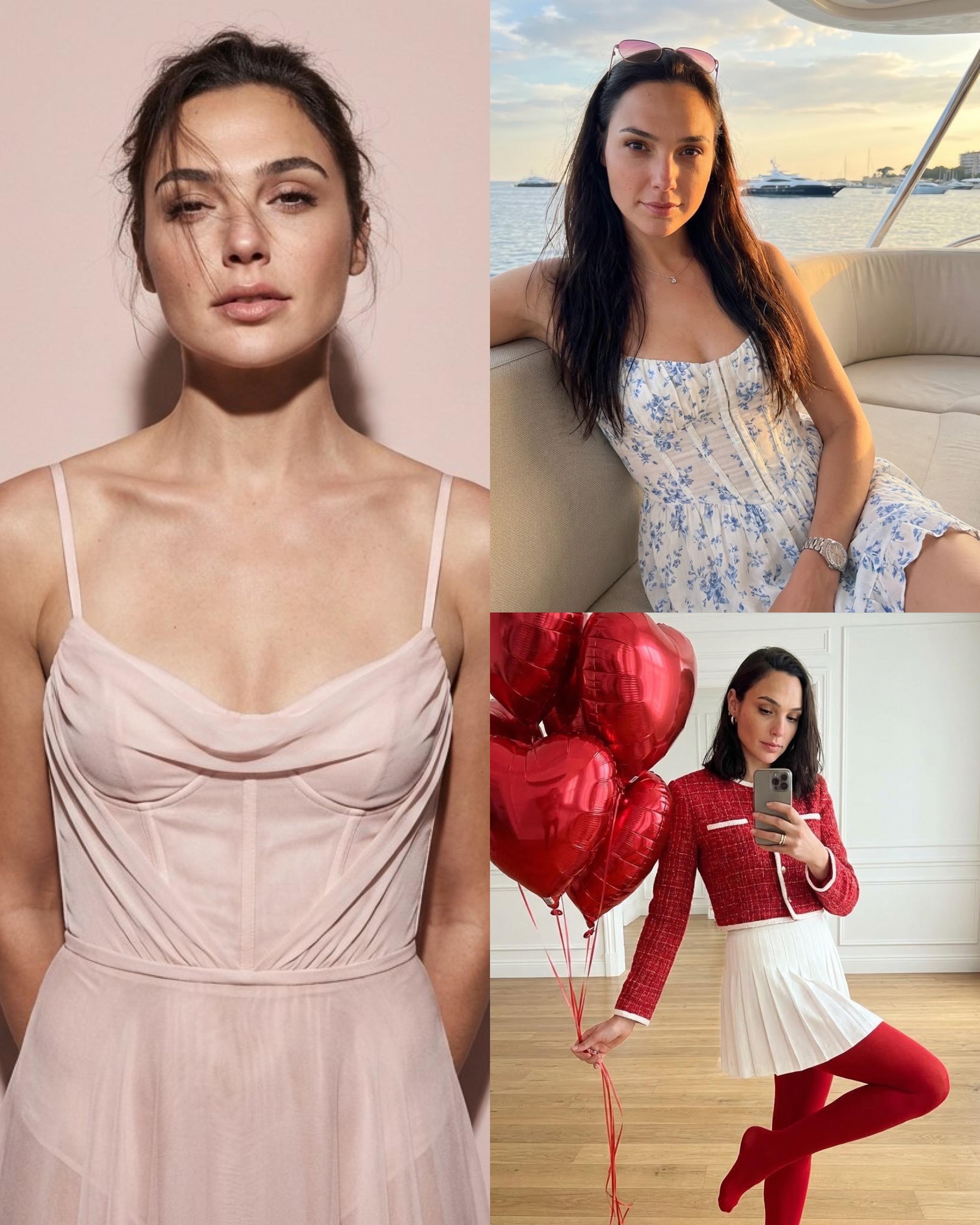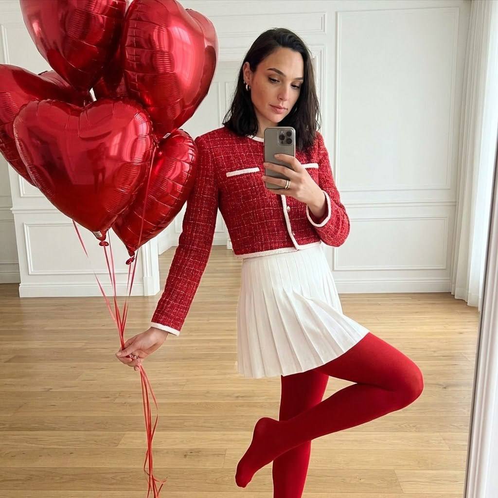 "Сохрани внешность, черты лица и природную асимметрию 1:1. Женщина высокая 178см смотрит в зеркало, держа в руке современный смартфон, как будто делает селфи. Композиция динамичная: свободная поза, правая нога согнута и слегка приподнята, акцент на фигуре и отражении, пропорции без каких либо изменений. Без морфинга и ретуши. Выражение лица спокойное, живое. Макияж: Ровный тон и темно коричневые длинные реснички Одежда и образ Красная твидовая укороченная куртка с белыми элементами на манжетах и по нижнему краю. Белая короткая плиссированная юбка. Ярко-красные плотные колготки, формирующие выразительный красно-белый ансамбль. Образ праздничный и стильный. Поза и жесты Поза расслабленная и динамичная. Смартфон в одной руке, взгляд направлен в зеркало. В левой руке — пучок алых воздушных шаров в форме сердечек. Телосложение Телосложение худое, аскетичное с длинными конечностями Аксессуары и детали Воздушные шары глянцевые, блестящие, отражают мягкий свет. Слабо различимы золотистые серьги и кольца, добавляющие утончённые акценты. Локация и фон Светлое просторное помещение с деревянным полом и белыми стенами с лепниной. Интерьер минималистичный, с чёткими линиями, подчёркивающими чистоту композиции. Свет Мягкий рассеянный свет. Он подчёркивает текстуры одежды, глянец шаров и архитектурные детали интерьера. Тени мягкие, объёмные, без жёстких контрастов. Негативный промпт Морфинг лица, изменение внешности, ретушь кожи, бьюти-фильтры, CGI, 3D, иллюстрация, мультфильм, wide-angle, fish-eye, искажения перспективы, жёсткий свет, шум, артефакты, сильная мимика, уменьшение глаз, увеличение скул, текст, водяные знаки"