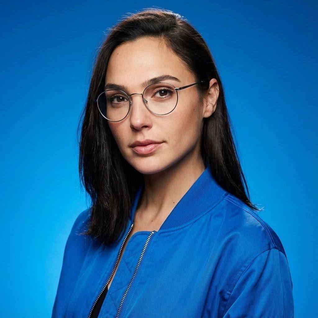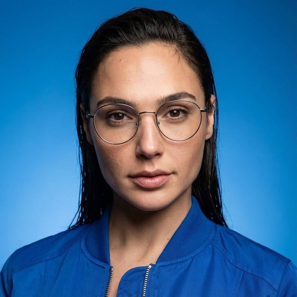 "сделай ультра реалистичное фото по моему селфи, перенеси меня в фотореалистичный редакционный студийный портрет, максимально сохраняя мою природную внешность 1-в-1: те же черты лица и пропорции, природную асимметрию, форму и цвет глаз, бровей и губ, линию роста волос, цвет и структуру волос; без морфинга/усреднения/face swap; не менять возраст; без бьюти-ретуши. Лицо 1-в-1 Сохранить идентичность без «улучшайзинга»: не менять форму головы, нос, губы, скулы, челюсть, подбородок, расстояния между чертами; сохранить естественную асимметрию. Кожа живая: поры, текстура, без пластика, без чрезмерного контраста на лице. Фигура Плечи стандартной ширины (не узкие), телосложение худое/аскетичное, длинные конечности. Поза и композиция Средний план, лицо и плечи в фокусе. Низкий ракурс, но без искажений перспективы: камера чуть ниже уровня глаз, не снизу подбородка. Голова слегка повернута, подбородок чуть опущен, чтобы линия челюсти выглядела мягче и естественнее. Взгляд чуть выше камеры, выражение серьёзное, но более мягкое и привлекательное, губы расслаблены. Фон и окружение Чистый насыщенный голубо-синий фон с мягким градиентом, без деталей и предметов. Свет и тени Ключевой свет большой мягкий софтбокс спереди-слева под углом 45°, мягко моделирует лицо, аккуратные тени под скулой и под носом без «провалов». Заполняющий свет слабее справа, чтобы сохранить драму, но не делать лицо жёстким. Лёгкий контровой сзади по волосам и плечам отделяет от фона, тонкий хайлайт по прядям. Контраст высокий, но кожа остаётся естественной, без грязи и без пересвета, neutral color harmony, premium editorial feel. Одежда Круглые очки в тонкой металлической оправе, без сильных бликов и без искажения глаз линзами. Ярко-синий бомбер, ткань реалистичная, молния и швы детальные, посадка аккуратная. Камера и объектив Портретная оптика 85mm, реалистичная перспектива, фокус на глазах, высокая детализация, фон мягко размытый. Негативный промпт изменение лица, изменение пропорций, изменение глаз/носа/губ/скул/челюсти, выравнивание или исправление природной асимметрии, омоложение/старение, морфинг/усреднение/face swap, чрезмерная ретушь и пластиковая кожа, агрессивный контуринг, слишком жёсткие тени на лице, пересветы, CGI/мультяшность, артефакты, шум, смаз, искажение перспективы «снизу вверх», сильные блики на очках закрывающие глаза, лишние предметы, текст, логотипы, водяные знаки."