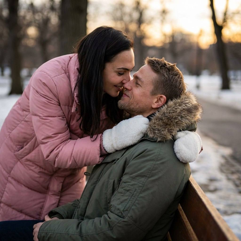 " Сделай реалистичное парное фото по двум загруженным селфи, максимально сохрани внешность обоих 1-в-1: те же черты лица и пропорции, природную асимметрию, форму глаз/бровей/губ/носа, линию роста волос; без морфинга, усреднения и face swap, не менять возраст. Телосложение: Девушка худенькая и высокая с длинными конечностями. Мужчина стандартного телосложения, одного роста с женщиной (сохрани пропорции) Поза и композиция Кадр по пояс/по бёдра, уличная лавочка в парке. Мужчина сидит на лавочке, девушка стоит сзади и наклоняется сверху и обнимает целуя мужчину. Ее волосы красиво свисают Лица очень близко, лёгкое касание лбами/носами, мягкая улыбка Без обнажения зубов, взгляд друг на друга. Руки естественные: только две руки у каждого, без лишних кистей; обнимающие руки вокруг плеч и груди, пальцы нормальной формы, без слипшихся. Лица в центре кадра, фон мягко размытый. Одежда Зимняя одежда : у девушки розовый пуховик как зефирка и белые пушистые варежки ; у мужчины зеленый зимний бомбер с мехом на капюшоне. капюшон лежит на плечах. Фон Зимний парк с деревьями и дорожками, лавочка, лёгкая боке-размытость, без посторонних людей рядом. Свет Закатный свет позднего дня,Высокий контраст и нассыщенность без вспышки и без студийного света. Камера 50–85mm, портретная перспектива без wide-angle искажений, малая ГРИП: лица резкие, фон размытый. Экспозиция сильно низкая.Кадр немного темный и насыщенный Негативный промпт Без изменения лиц и асимметрии, без бьюти-ретуши и “пластика”. Без лишних рук/пальцев/конечностей, без третьей руки в кадре. Без лишних морщин и старения и мешков под глазами. Без лишних людей на фоне, без текста/логотипов/водяных знаков. Без перекоса перспективы и широкоугольных искажений, без высокой экспозиции,Без видимых зубов"