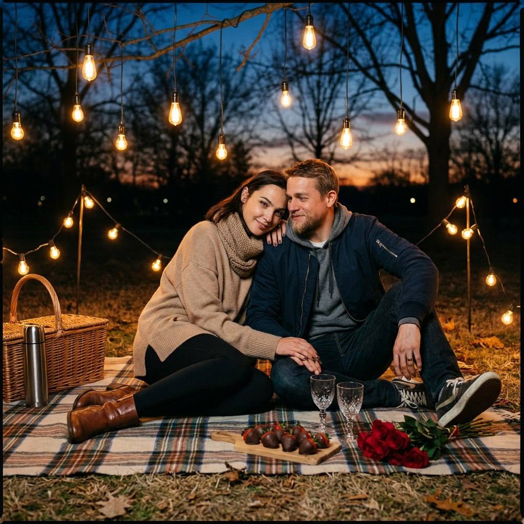 " Вечерний пикник с гирляндами: Valentine's Day под открытым небом Сцена и атмосфера Пара сидит на мягком пледе в парке в сумерках, окружённая тёплым светом гирлянд. Они сидят близко друг к другу, мужчина обнимает женщину за плечи, она слегка прислонилась к нему. Перед ними — корзина для пикника, термос, клубника в шоколаде на деревянной доске. Атмосфера уединённого романтического вечера, интимности и волшебства, как будто весь мир остановился только для них двоих. Женщина — полное сохранение внешности с фото: черты лица, форма глаз, губ, носа, линия бровей, оттенок кожи, макияж, длинные прямые темные волосы с центральным пробором. Пропорции: худое телосложение, длинные конечности, рост 178 см. Мужчина — полное сохранение внешности с фото: форма лица, борода, причёска, линия роста волос, оттенок кожи, телосложение. Никакой стилизации или изменения черт. Рост 178 см. Одинаковый рост с женщиной. Одежда и детали Женщина: уютный бежевый oversized свитер, чёрные леггинсы или джинсы, удобные ботинки. На шее — лёгкий шарф. Одежда тёплая, комфортная, располагающая к вечерней прогулке. Мужчина: тёмно-синяя или чёрная куртка-бомбер, серый худи под ней, тёмные джинсы, кроссовки. Стиль casual и расслабленный. На пледе: плетёная корзина, термос, два бокала, деревянная доска с клубникой в шоколаде, несколько красных роз лежат рядом. Тёплый плед в клетку или однотонный серо-бежевый. Без логотипов и ярких надписей. Локация и фон Вечерний парк или поляна: вокруг пары развешаны тёплые гирлянды на деревьях или невысоких стойках, создающие мягкое золотистое свечение. На заднем плане — силуэты деревьев, слегка размытое небо в сумерках (deep blue hour). Земля покрыта травой или лёгким снегом. Атмосфера камерная, уютная, как маленький оазис света в темноте. Свет Основной источник — тёплые гирлянды с лампочками Edison-стиля, создающие мягкое золотистое свечение на лицах и фигурах. Лёгкий контровой свет от заходящего солнца или сумеречного неба (deep blue). Мягкие тени, блики в глазах от гирлянд. Общая тональность тёплая, романтичная, с лёгким контрастом между золотым светом гирлянд и холодным синим небом. Камера и оптика Full-frame камера, объектив 35–50 мм, f/1.8–2.0. Средняя глубина резкости: пара в резком фокусе, гирлянды создают мягкое боке в фоне. Лёгкая зернистость плёнки для создания атмосферы. Реалистичная перспектива, естественные пропорции. Угол съёмки слегка сверху, как будто фотограф стоит рядом. Цвет и обработка Кинематографическая цветокоррекция с акцентом на контраст тёплого и холодного: золотистые тона гирлянд и кожи, глубокий синий оттенок неба и теней. Красные акценты клубники и роз. Умеренный контраст, живое зерно, мягкие переходы между светом и тенью. Без пластиковой ретуши, естественная текстура кожи и материалов. Композиция Горизонтальный кадр, пара слегка смещена от центра по правилу третей. Гирлянды обрамляют сцену сверху и по бокам. Корзина и еда в нижней части кадра создают передний план. Композиция сбалансированная, но не идеально симметричная — ощущение живого момента. Настроение Тихая романтика, близость, ощущение особенного момента вдвоём. Лёгкая улыбка или нежный взгляд друг на друга. Без наигранности, естественная связь между людьми. Негативный промпт морфинг лиц, изменение внешности, пластиковая ретушь кожи, HDR, перенасыщенность, студийный свет, жёсткие тени, wide-a