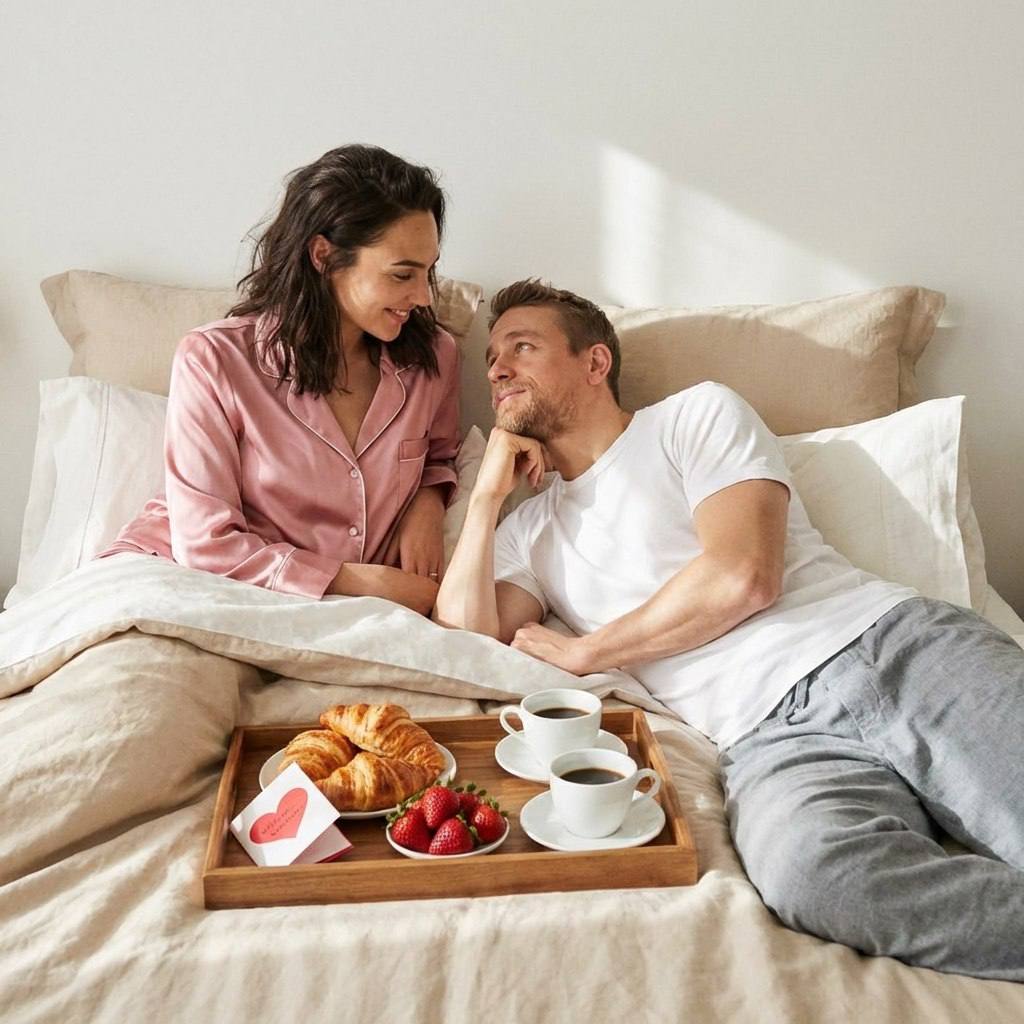 " Романтический завтрак в постели: утро 14 февраля Сцена и атмосфера Пара в постели, утреннее Valentine's Day. Перед ними поднос с завтраком: круассаны, клубника, кофе, маленькая открытка в форме сердца. Она сидит, опираясь на подушки, он лежит рядом, подперев голову рукой, смотрит на неё. Атмосфера нежности, уюта, интимного момента вдвоём. Женщина — полное сохранение внешности с фото: черты лица, глаза, губы, нос, брови, кожа, волосы, пропорции. Рост 178 см. Мужчина — полное сохранение внешности с фото: лицо, борода, причёска, кожа, телосложение. Рост 178 см. Одежда Она: шёлковая пижама пудрово-розового цвета, волосы слегка растрёпаны. Он: белая футболка, серые пижамные штаны. На подносе: белая посуда, красная клубника, круассаны, две чашки кофе. Локация Спальня, светлое постельное бельё бежево-белых оттенков, мягкие подушки, окно за кадром пропускает утренний свет. Свет Мягкий естественный утренний свет из окна, тёплый и рассеянный. Лёгкие тени, нежные блики. Общая тональность светлая, воздушная. Камера Full-frame, 50 мм, f/2.0. Средний план, небольшая глубина резкости: лица чёткие, фон мягко размыт. Цвет Тёплая пастельная палитра: бежевые, розовые, белые тона. Красные акценты клубники. Натуральная обработка, лёгкое зерно. Композиция Горизонтальный кадр, пара в центре, поднос между ними. Взгляды: он на неё, она на него с лёгкой улыбкой. Негативный промпт морфинг лиц, изменение внешности, ретушь, HDR, жёсткие тени, студийный свет, логотипы, открытые зубы, драматичные позы"
