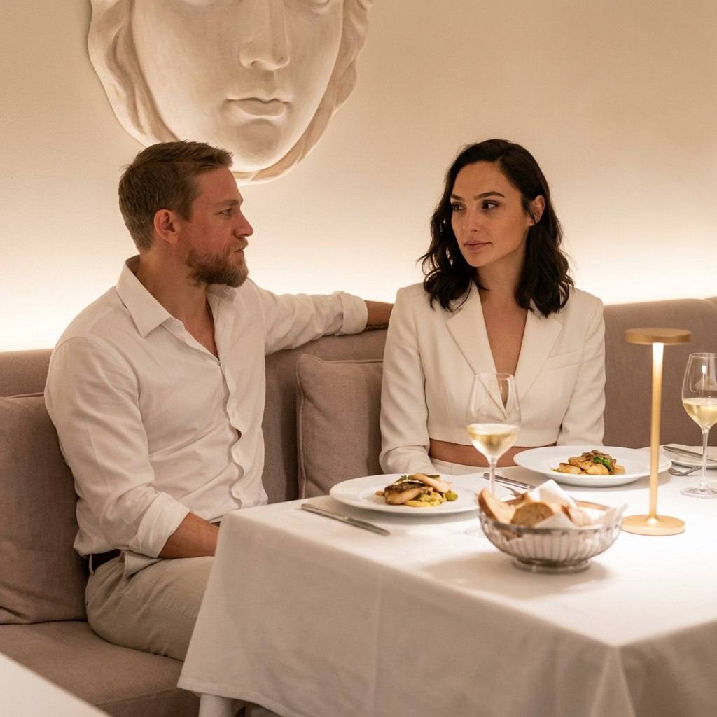 " Фотореалистичное lifestyle / couple / fine dining фото, эффект «пойманного момента», спокойная премиальная атмосфера, без ощущения постановочной съёмки Мужчина и женщина, внешность, черты лица и природная симметрия обоих строго сохранены без изменений и морфинга. Женщина: худое телосложение, длинные конечности, рост 178 см. Длинные темные волосы, уложенные мягкими волнами с центральным пробором, аккуратный вечерний макияж без перегруза. Мужчина: обычное мужское пропорциональное телосложение, спокойный уверенный взгляд. Одежда и аксессуары Женщина в белом укороченном жакете/блузе с длинным рукавом, подчёркивающем линию талии. Мужчина в белой рубашке с расстёгнутыми верхними пуговицами и светлых брюках. На столе: белая скатерть, тарелки с блюдами, хлеб в корзинке, бокалы с белым вином, столовые приборы. Минималистичный настольный светильник с тёплым светом. Поза и настроение Пара сидит рядом на мягком диване, тела слегка наклонены друг к другу. Мужчина расслабленно опирается рукой на спинку дивана. Женщина сидит прямо, собранно, со спокойным выражением лица без мимики. ощущение близости и тихого вечера вдвоём, без демонстративных эмоций. Окружение Уютный современный ресторан с мягкими линиями и нейтральной цветовой палитрой. За спиной пары — декоративная настенная скульптура лица в светлых оттенках с мягкой подсветкой. Интерьер минималистичный, премиальный, без визуального шума. Свет Мягкий тёплый интерьерный свет от настольной лампы и общего освещения зала. Свет равномерно освещает лица, создаёт объём без жёстких теней. Лёгкие цветовые рефлексы от декоративной подсветки на фоне, без пересветов. Камера и параметры съёмки Full-frame камера, объектив 50mm, f/2.0–2.5, ISO 100–200, 1/125s. Средний план, чёткий фокус на паре, фон слегка размыт. Натуральная перспектива без wide-angle искажений. Цвет и атмосфера Светлая, тёплая палитра: белый, бежевый, кремовый с мягкими пастельными акцентами. Атмосфера уюта, статуса и спокойной элегантности. Кадр выглядит как реальный момент из жизни стильной пары. Негативный промпт Без морфинга и изменения внешности, без неестественных пропорций, без ретуши кожи и пластикового эффекта, без wide-angle искажений, без пересветов и жёстких теней, без шума, без AI-артефактов, без мультяшности, без лишних предметов и людей в кадре, без морщин, мешков под глазами, тёмных кругов и синяков."
