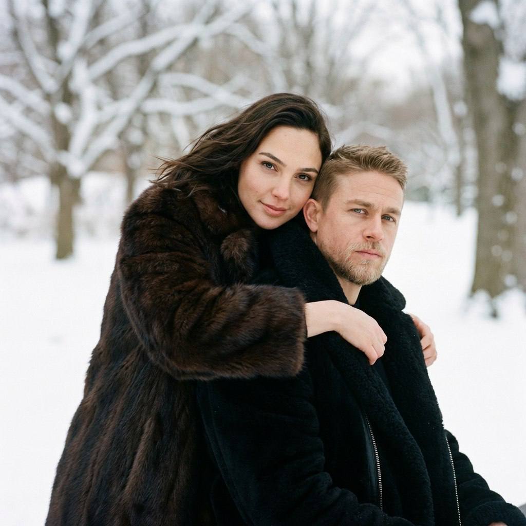 "Зимний портрет пары: объятие со спины Сцена и атмосфера Зимний портрет пары в парке. Мужчина сидит боком к камере, женщина стоит сзади и обнимает его через плечи. Атмосфера близости, тепла среди зимы, нежности и серьёзности момента. Натуральная детализация, фотореализм. Женщина — СТРОГО сохранить внешность с загруженного фото 1:1: лицо, черты, форма глаз, губ, носа, линия бровей, оттенок кожи, текстура, возраст, пропорции. Не менять. Загруженное фото — единственный эталон внешности. Мужчина — СТРОГО сохранить внешность с загруженного фото 1:1: форма лица, борода, причёска, линия роста волос, кожа, текстура, телосложение, возраст, пропорции. Не менять. Загруженное фото — единственный эталон внешности. Поза СТРОГО Мужчина сидит боком (в профиль) к камере, корпус развёрнут вправо или влево. Голова повёрнута к камере, взгляд направлен в объектив. Женщина СТРОГО СЗАДИ него, наклонена вперёд, обнимает мужчину руками вокруг плеч со спины. Её предплечья лежат на его груди крест-накрест или параллельно. Контакт плотный, тесный. Её голова рядом с его головой или чуть выше, на одном уровне. Взгляд женщины направлен в камеру. Поза зафиксирована, статичная. Одежда и детали Мужчина: чёрная меховая дублёнка, мех густой, натуральная текстура. Женщина: тёмно-коричневая меховая шуба, мех пушистый, объёмный. Волосы естественно растрёпаны (если длинные), допускается лёгкое движение от ветра. Без украшений, без шарфов, без шапок. Локация и фон Зимний парк: деревья в снегу, ветви покрыты инеем или снегом. Фон равномерно размыт в мягкое боке, детали читаются, но не отвлекают. В кадре НЕ видно лавочку и другие посторонние предметы — только деревья и снег. Атмосфера зимнего дня, спокойная и чистая. Свет Естественный дневной свет, мягкий и рассеянный (пасмурный день или лёгкая облачность). Низкий контраст, плавные переходы между светом и тенью. Без жёстких теней, без пересветов. Свет равномерно распределён по лицам и фигурам. Камера и оптика Камера Sony FX2, объектив 50-85 мм, f/2.0-2.8. Камера на уровне глаз. Кадр по плечи (портрет средним планом). Средняя глубина резкости: лица и фигуры в резком фокусе, фон в мягком боке. Лёгкое плёночное зерно, характерное для плёночной фотографии. Цвет и обработка Натуральная цветопередача с мягкими тонами: чёрный мех дублёнки глубокий, коричневый мех шубы тёплый, кожа с естественным оттенком, белый снег на фоне. Низкий контраст, плавные переходы. Лёгкое плёночное зерно по всему кадру. Натуральная детализация без чрезмерной обработки. Композиция Горизонтальный формат. Мужчина в центре или слегка смещён, женщина за ним. Оба лица видны и направлены в камеру. Композиция сбалансированная, статичная. Выражение лиц Мужчина: серьёзное, сосредоточенное выражение, без улыбки. Взгляд прямой, уверенный. Женщина: нежная лёгкая улыбка, влюблённый мягкий взгляд. Глаза тёплые, выражение нежное и счастливое. Настроение Близость, интимность, тепло на фоне холодной зимы. Контраст серьёзности мужчины и нежности женщины. Атмосфера спокойствия и глубокой связи. Технические параметры Максимально фотореалистичный портрет, высокая детализация текстур: видимая структура кожи, меха, волос. Естественная текстура без сглаживания. Негативный промпт морфинг лиц, изменение внешности, ретушь кожи, сглаживание текстуры, идеализация черт, высокий контраст, HDR, жёсткие т