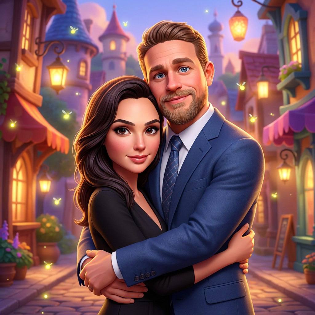 "Создай мультяшное изображение в стиле современной Disney, обязательно преврати в мультяшных персонажей обоих людей с прикреплённых фото, но сохрани черты лица мужчины и женщины с прикреплённых фото на 100 %: форма глаз, носа, губ, скул, бровей, цвет глаз, причёски, возраст — всё точно 1:1. одежда: не меняй ни цвет, ни фасон, ни детали — полностью копируй то, что на фото Поза: девушка стоит прямо, парень обнимает её сзади обеими руками за талию, кладёт подбородок ей на макушку, оба смотрят в камеру с лёгкой счастливой улыбкой. Фон: яркая мультяшная улица в стиле Disney — разноцветные домики, волшебные фонари, лёгкий вечерний свет, парящие огоньки, сказочная атмосфера. Стиль: 3D-мультипликация Disney, идеальная детализация одежды и волос, лица фотореалистично точные внутри мультяшки. "