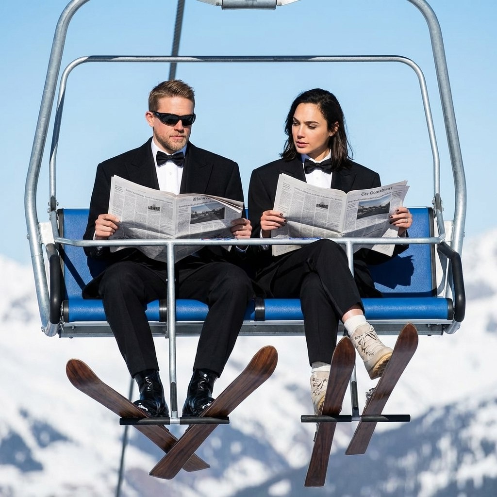 "Стиль и общая концепция Фотореалистичное изображение с кинематографической выразительностью, передающее атмосферу роскоши и элегантности в духе Куршевеля. Основная идея — контраст между строгой деловой одеждой и обстановкой горнолыжного курорта. Палитра холодная: голубые и белые тона с акцентным черным. Изображение должно иметь сверхвысокое разрешение (8K) и высокую текстурную детализацию. Поза и композиция Пара (парень и девушка) сидят рядом на открытом кресельном подъемнике. Кадр снят с нижнего ракурса, что подчеркивает монументальность сцены и уходящие в перспективу тросы подъемника. Оба персонажа сидят в спокойных, расслабленных позах. Каждый держит перед собой двумя руками раскрытую газету, как будто читая. Внешность и телосложение Важно: Внешность, черты и пропорции лиц парня и девушки должны быть сохранены 1:1 с предоставленных референсных фотографий. Парень: Сидит слева. Прическа сохранена с референса. На нем черные солнцезащитные очки спортивной формы. Девушка: Сидит справа. Одежда Оба одеты в строгие черные деловые костюмы в стиле oversize: Пиджаки: Черные, свободного кроя. Рубашки: Классические белые. Аксессуары: Черные галстуки-бабочки. Брюки: Черные, широкие. Обувь парня: Блестящие черные ботинки. Обувь девушки: Светлые ботинки, из-под брюк видны белые носки. Спортивный инвентарь Оба персонажа на лыжах. Лыжи — винтажные, деревянные, с видимой текстурой дерева. Фон Небо: Чистое, ярко-голубое, солнечный день. Задний план: Снежные горные склоны, сияющие на солнце. Фон должен быть размыт (боке), чтобы сфокусировать внимание на паре. Подъемник: Кресло имеет металлический блестящий каркас и ярко-голубое сиденье. Каркас отражает дневной свет и отбрасывает реалистичные тени. Свет Ровный, яркий верхний солнечный свет. Он должен подчеркивать текстуры тканей костюмов, дерева лыж и блеск металла, создавая объем и глубину. Камера Съемка с нижнего ракурса. Объектив без сильных искажений, создающий кинематографическую перспективу. Фокус на паре и их одежде. Негативный промпт Изменение черт лица с референса, face swap, morphing, усредненная внешность, мультяшный стиль, рисунок, 3D-рендер, искажение пропорций, другая одежда, отсутствие газет, пасмурная погода, грязный снег, визуальный шум, размытые текстуры, пересветы, глубокие тени на лицах, текст, логотипы."