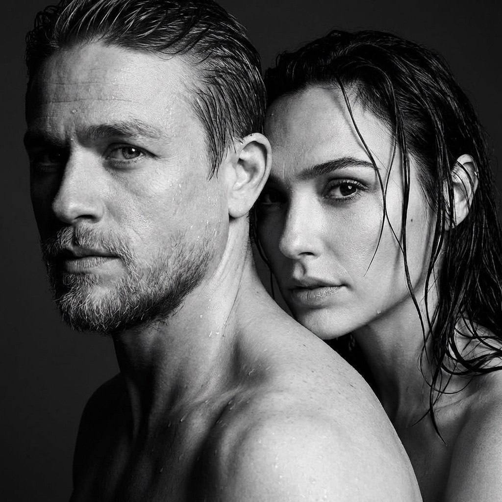"СТРОГО СОХРАНИ ВНЕШНОСТЬ двух людей с прикреплённых фото, 1:1 без ЛЮБЫХ изменений. Не менять форму и пропорции лиц, индивидуальные черты и мимику. Чёрно-белый ультра-реалистичный студийный портрет. Мужчина стоит СПЕРЕДИ, корпус развернут в сторону от камеры, лицо в лёгком профиле. Женщина находится ПОЗАДИ мужчины, стоит вплотную, повторяет направление его корпуса. Она плотно прижимается к его спине, её плечо и щёка касаются верхней части его спины. Очень крупный портретный кадр: видны только лица, шея и верх плеч. В кадре нет видимой одежды, ткани или аксессуаров — только кожа и мокрые волосы. У мужчины и женщины мокрые волосы и влажная кожа, капли воды на лице и шее. У женщины влажные пряди прилипают к лицу, вискам и щеке, без аккуратной укладки. Эффект свежей влаги после дождя. Оба с серьёзным, напряжённым выражением. Контрастный студийный свет, глубокие тени. Минималистичный тёмный фон. Фотореализм, высокая детализация, без лишних объектов."
