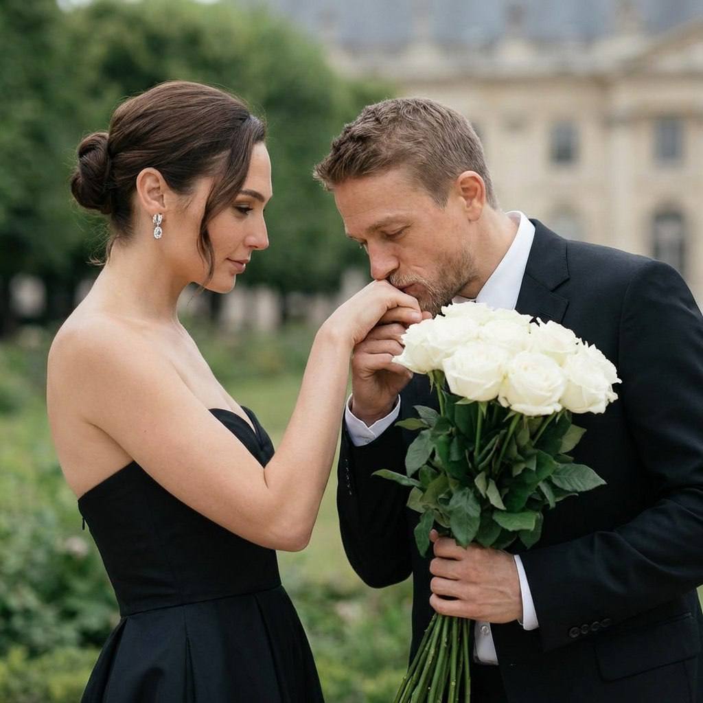"Лица людей оставить строго без изменений. Мужчина и женщина запечатлены в элегантной постановочной сцене на открытом пространстве дворцового сада, на фоне мягко размытой зелени деревьев и классического здания вдали. Пара стоит очень близко друг к другу, создавая интимную и утончённую композицию. Женщина расположена слева, её корпус слегка развёрнут к мужчине, голова опущена, взгляд направлен вниз, выражение лица спокойное, нежное. Она протягивает руку вперёд, позволяя мужчине поцеловать её кисть. На ней чёрное вечернее платье без бретелей с подчёркнутой талией и пышной юбкой, образ минималистичный и изысканный. Волосы собраны в аккуратный низкий пучок с мягкими прядями у лица, на ушах элегантные серьги с камнями. Мужчина стоит справа, корпус слегка наклонён вперёд, он бережно держит руку женщины и целует её, глаза опущены, выражение лица сосредоточенное, уважительное и романтичное. В другой руке он держит большой букет белых роз с длинными стеблями. На нём чёрный классический костюм с белой рубашкой без галстука, образ строгий, современный и элегантный. Поза пары подчёркивает галантность, романтику и спокойную близость. Атмосфера кадра торжественная, утончённая и кинематографичная, с ощущением изысканного свидания или предсвадебной съёмки. Освещение естественное, мягкий дневной свет без резких теней, равномерно подчёркивает лица, текстуру кожи и ткани одежды. Ракурс фронтальный, уровень глаз, средний портрет с акцентом на жест и эмоции. Обработка фотографии реалистичная и художественная: мягкая цветокоррекция, приглушённые натуральные оттенки, лёгкий контраст, сохранённая текстура кожи, малая глубина резкости с мягким боке фона. Эффекты минимальные, без стилизации под рисунок, ощущение профессиональной fashion- и wedding-съёмки на полнокадровую камеру с портретным объективом. Негативный промт: деформированные лица, изменённая внешность, искажённые черты лица, низкое качество, нереалистичная кожа, нереалистичные модели, нарисованное фото, нереалистичное фото."