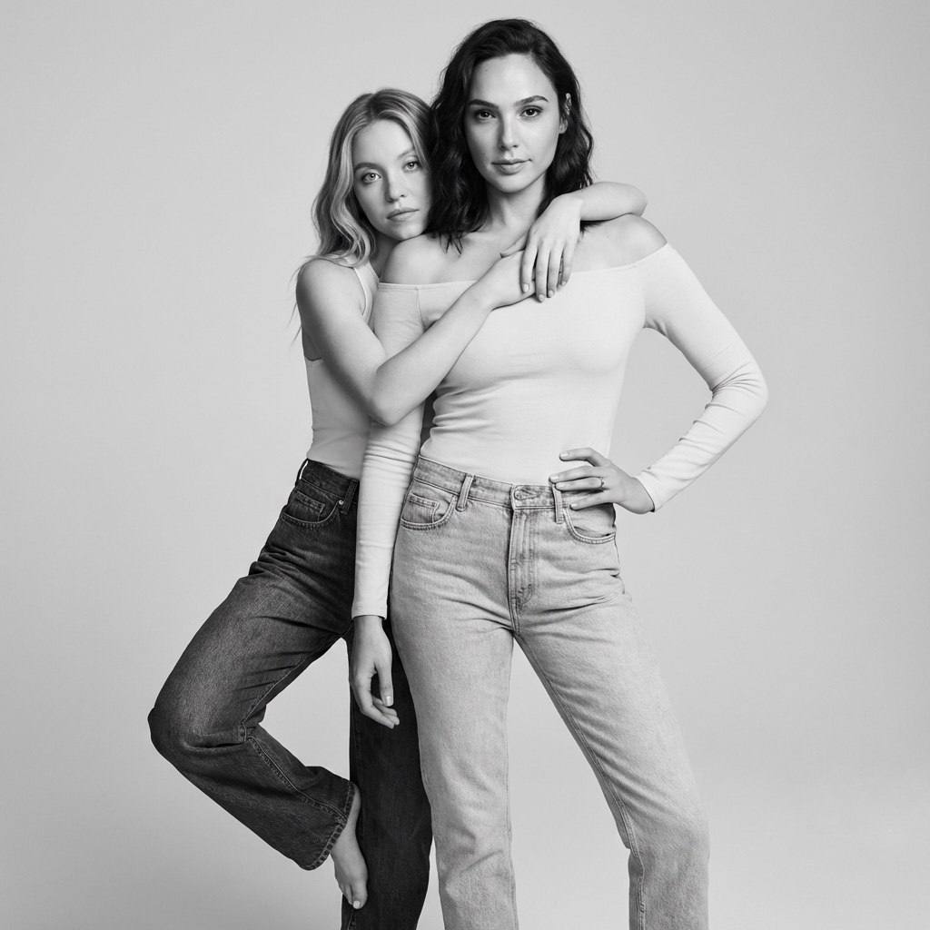 " Лица людей оставить строго без изменений. Две девушки запечатлены в чёрно-белом студийном портрете на нейтральном светлом фоне. Правая девушка находится на переднем плане, стоит уверенно, корпус слегка развёрнут влево, одна рука упирается в бок, другая расслабленно опущена вниз. Её взгляд направлен прямо в камеру. На ней светлый облегающий лонгслив с открытыми плечами и светлые прямые джинсы, образ минималистичный и современный. Волосы волнистые, распущены и уложены естественно. Левая девушка стоит позади и сбоку, она обнимает переднюю девушку руками за плечи, её корпус наклонён вперёд, одна нога слегка приподнята, создавая динамику. Её голова наклонена к подруге, взгляд направлен в камеру. На ней светлая майка без рукавов и тёмные свободные джинсы, образ простой и естественный. Волосы уложены мягкими волнами, без сложной укладки. Поза двух моделей передаёт близость, доверие и живую эмоциональную связь. Атмосфера кадра спокойная и стильная. Фон полностью нейтральный, без деталей, усиливает фокус на телах, жестах и взаимодействии. Освещение мягкое студийное, равномерное, без жёстких теней, подчёркивает текстуру кожи и ткани. Ракурс фронтальный, уровень глаз, ростовой или поясной портрет. Обработка фотографии чёрно-белая, реалистичная, с умеренным контрастом, сохранённой детализацией кожи и натуральной пластикой света. Эффекты минимальные, без художественной стилизации, ощущение профессиональной фотосъёмки на полнокадровую камеру с портретным объективом. Негативный промт: деформированные лица, изменённая внешность, искажённые черты лица, низкое качество, нереалистичная кожа, нереалистичные модели, нарисованное фото, нереалистичное фото."