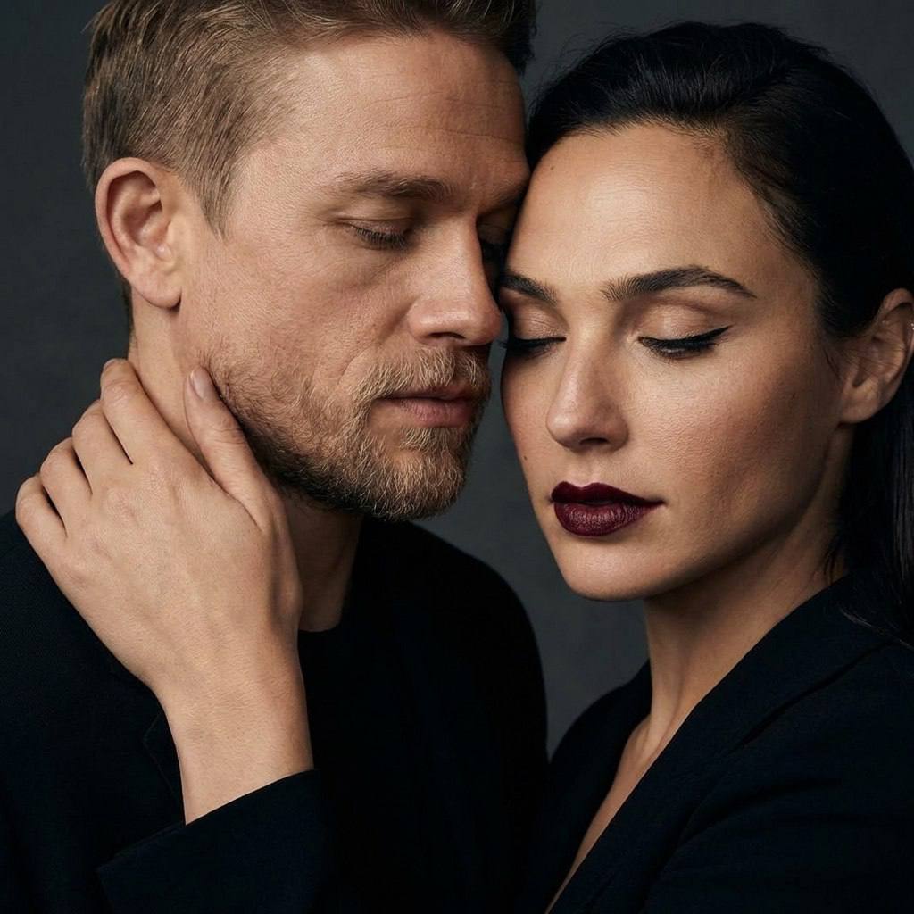 "Фотореалистичная интимная сцена с мистическим настроением. Молодые мужчина и женщина стоят в тесной близости, мужчина за женщиной. Композиция плотная, камерная, фокус на эмоциональной связи и телесном контакте, без лишнего пространства. Внешность Внешность обоих сохранена 1-в-1 по исходному фото: черты лица, природная асимметрия, пропорции без изменений. Без морфинга и ретуши. Телосложение и рост Женщина — худое, аскетичное телосложение с длинными конечностями, рост 178 см. Мужчина 36 лет — рост 178 см, одного роста с женщиной, телосложение обычное, реалистичное. Поза и взаимодействие Мужчина стоит за женщиной, голова наклонена вправо, глаза закрыты. Левая рука мягко и бережно охватывает её шею. Женщина слегка наклонена назад, глаза закрыты, тело расслаблено. Контакт нежный, без агрессии. Образ и детали женщины волосы свободно спадают, слегка взъерошены. Яркий макияж: чёткие стрелки и насыщенно-бордовая помада. Выражение лица спокойное, уверенное, сосредоточенное на внутреннем ощущении. Одежда и фактуры Оба в чёрной одежде с матовой текстурой. Ткани плотные, мягкие, подчёркивают форму тела и движение, не отвлекая внимание. Свет и фон Мягкий кинематографический свет сверху и слева подчёркивает объём лица, рук и тела, создаёт тёплые тени. Фон однородный, серо-тёмный, слегка размытый. Цвет и атмосфера Приглушённая серо-чёрная палитра с акцентом на естественные оттенки кожи и яркость макияжа. Атмосфера утончённая, драматичная, интимная, ощущение спокойной нежности. Высокая детализация, фотореализм, 8K. Негативный промпт Морфинг лиц и тел, изменение внешности, изменение возраста, морщины, мешки под глазами, синяки, запалые глаза, признаки усталости или старения, ретушь кожи, бьюти-фильтры, порнография, агрессия, мультфильм, иллюстрация, CGI, 3D, текст, логотипы, водяные знаки, резкий свет, wide-angle, fish-eye, искажения перспективы, шум, артефакты."