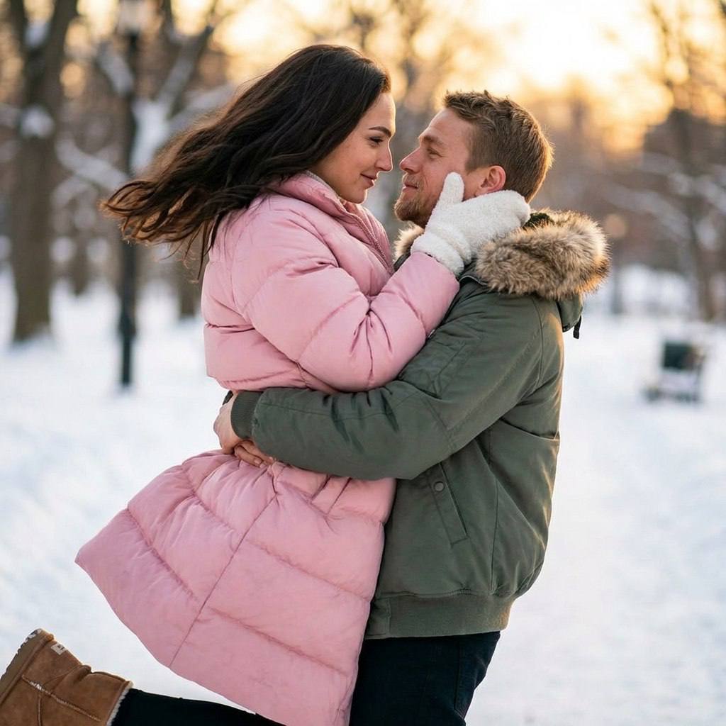 " Сделай реалистичное парное фото по двум загруженным селфи, максимально сохрани внешность обоих 1-в-1: те же черты лица и пропорции, природную асимметрию, форму глаз/бровей/губ/носа, линию роста волос; без морфинга/усреднения/face swap; не менять возраст. Телосложение Девушка высокая, худенькая, длинные конечности. Мужчина стандартного телосложения, одного роста с женщиной, пропорции сохранить. Поза и композиция Кадр по пояс/по бёдра, зимний парк. Мужчина подхватил женщину на руки и кружит, она оторвана от земли; лёгкий разлёт волос, лёгкий смаз волос от движения. Они смотрят друг на друга, мягкие улыбки без видимых зубов. Лица в центре кадра, близко, но без сильного прижатия. Руки и хват анатомически естественные. Одежда Девушка: розовый пуховик «зефирка», белые пушистые варежки.Угги на ногах. Мужчина: зелёный зимний бомбер с мехом, капюшон лежит на плечах. Фон Зимний парк с деревьями и дорожками, без посторонних людей рядом, фон сильно размытый (боке). Свет и камера Закатный свет, высокий контраст и насыщенность, без вспышки и студийного света. 50–85mm, без wide-angle искажений, малая ГРИП: лица резкие, фон размытый.Легкий смаз на развивающихся волосах и ногах девушки- показывающий движение кадра. Низкая экспозиция: кадр тёмный и насыщенный. Негативный промпт Не менять лица/пропорции/асимметрию; без морфинга/face swap; без бьюти-ретуши и «пластика»; без уменьшения глаз и увеличения скул. Без лишних рук/пальцев/конечностей, слипшихся пальцев и «ломаных» суставов. Без старения, морщин и мешков под глазами. Без лишних людей, текста/логотипов/водяных знаков. Без перспективных перекосов, широкоугольных искажений и пересвета. Без видимых зубов.Без высокой экспозиции"