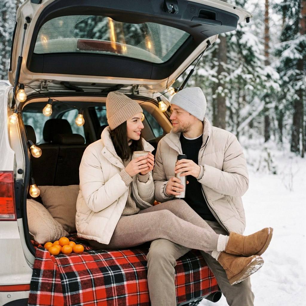 " Используй фото 1 и фото 2 - как единственные референсы внешности героев фото. сохрани их естественную природную асимметрию лиц, и черты лица Телосложение Женщина: высокая, стройная, длинные конечности, тонкая талия, естественные пропорции. Мужчина: стандартное телосложение, одного роста с женщиной, естественные пропорции. макияж у женщины- длинные ресницы, легкие румяна. Поза и композиция Открытый багажник автомобиля в зимнем лесу, снег вокруг. Женщина и мужчина сидят на клетчатом пледе в багажнике, близко друг к другу, расслабленно и уютно. Женщина слева: слегка развёрнута к мужчине, в руках чашка с горячим напитком. Мужчина справа: держит открытый термос с горячим напитком. Ноги естественно расположены, позы без неестественных изгибов. на лицах мягкие полуулыбки, без видимых зубов. Одежда Зимний светлый уютный стиль: шапки-бини, пуховики (молочный/беж/светло-серый), вязаные свитеры, тёплые брюки. Варежки. Зимняя обувь без “пластика”, реалистичные материалы. Детали и фон Клетчатый плед в багажнике, рядом подушки и мандарины. По крышке багажника — гирлянда из крупных шариков, шарики светятся тёплыми огоньками (warm fairy lights), давая мягкие тёплые блики на лицах и одежде. Лес на заднем плане слегка размытый, без лишних людей и надписей. Свет и цвет Зимний дневной мягкий свет + тёплое свечение гирлянды. Снег чистый белый, без синевы; кожа естественная без оранжевины. Мягкий контраст, аккуратная “cozy film” подача. Камера 50mm, естественная перспектива без wide-angle, фокус на паре и тёплых огоньках гирлянды, фон мягко размытый.Теплая обработка кадра, низкая экспозиция, легкое пленочное зерно. Негативный промпт Видимые зубы при улыбке у кого либо, wide-angle/fisheye,изменение формы глаз и размеров глаз, уменьшение глаз, изменение внешности, стеклянный взгляд, искажения пропорций (особенно рост/конечности), лишние конечности/пальцы, кривые руки, пластик/ретушь, мультяшность/CGI, текст/логотипы/водяные знаки, лишние люди на фоне."