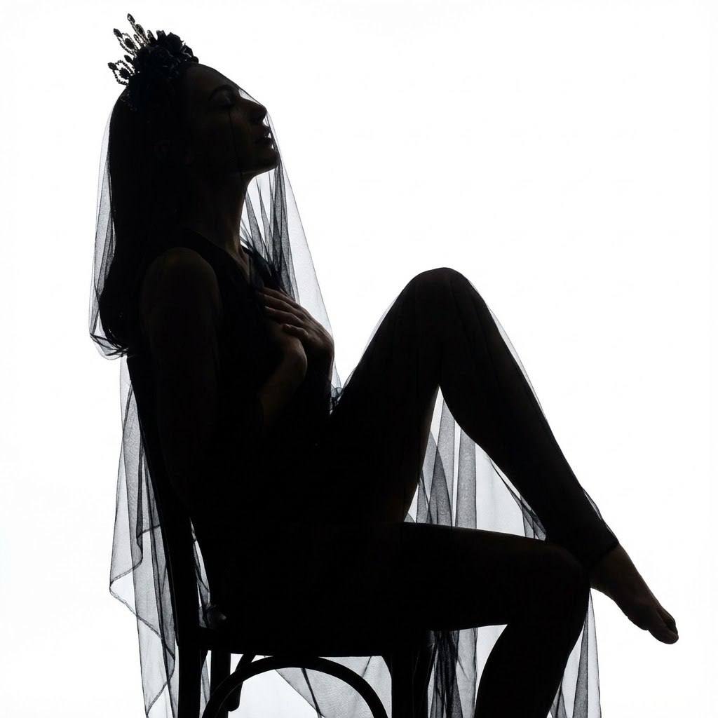 "Сделай реалистичное фото по моему фото/селфи, Поза и композиция Силуэтный кадр в полный рост. Человек сидит на простом стуле строго в профиль. Одна нога согнута и подтянута, вторая вытянута. Корпус слегка изогнут. Голова наклонена назад и направлена вверх. Одна рука прижата к груди под тканью. Кадр статичный, графичный, фигура занимает большую часть кадра. Телосложение Худое, аскетичное,Длинные тонкие руки и ноги. Одежда и образ Чёрная полупрозрачная вуаль полностью накрывает голову и тело, образуя единый тёмный силуэт. На голове венец с чёрными цветами и кристаллами, читается только по контуру. Фон Чистый белый фон без текстуры и деталей, как будто сияние света. Свет Сильный контровой свет строго сзади. Передний и заполняющий свет отсутствуют. Лицо и тело полностью в тени: никаких черт лица, никаких деталей кожи, никаких деталей одежды внутри силуэта. Видны только контур фигуры и тонкий край вуали. Камера Портретная перспектива, 50–85 mm, без широкоугольных искажений, фотореализм. Негативный промпт видимые черты лица, видимые глаза/нос/губы, подсветка лица или тела, объёмный свет, полутени внутри силуэта, детали кожи, детали одежды,Не прозрачная вуаль, блики, серый фон, фон с деталями, текст, логотипы, HDR, мультяшность.Без обрезанных рук и ног"