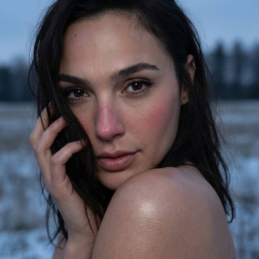 "СТРОГО СОХРАНИ ВНЕШНОСТЬ девушки с прикреплённого фото, 1:1 её настоящее лицо, глаза, нос, кожа с порами — всё 100% без изменений. Используй отправленное фото как эталон. Максимально сохранить внешность 1-в-1: те же черты лица, пропорции, природную асимметрию, форму и разрез глаз, брови, губы, нос, линию роста волос. Без морфинга, усреднения и face swap. Не менять возраст. Без бьюти-ретуши и «пластиковой» кожи. Не менять форму глаз/носа/губ/скул/челюсти/овала, не уменьшать глаза, не искажать пропорции лица. Загруженное фото — единственный эталон внешности. ПОЗА И КОМПОЗИЦИЯ Крупный план (Close-up) лица и плеча девушки. Видно только плечо, волосы и лицо. Взгляд прямо в камеру через плечо, выразительные глаза. Девушка закрывает часть щеки рукой, взгляд мечтательный. Образ мечтательный и нежный. ТЕЛОСЛОЖЕНИЕ Видно только плечо. На теле хайлайтер для сияния кожи. ОДЕЖДА Отсутствие одежды (nude shoulders). Не переносить одежду с референса. МАКИЯЖ / ПРИЧЁСКА Макияж: тонкие чёрные стрелки, пышные ресницы. Легкий макияж. Румяна от холода на носу и щеках. Текстурная детализация, видны несовершенства лица (поры, текстура). Причёска: волосы красиво растрёпанны, частично закрывают лицо. ФОН Зимнее холодное пространство, размытое зимнее поле в сумерках. Усиливает концентрацию на лице. СВЕТОТЕНЕВОЙ РИСУНОК (Lighting & Shadows) Тусклый свет, подчеркивающий объем, создавая кинематографичную атмосферу. Мягкие тени (Soft shadows) для создания уютной зимней атмосферы. Дымка (Volumetric shadows) для создания глубины и атмосферы зимнего вечера. КАМЕРА 8k. Фотореалистичный стиль. Фокус на глазах. Небольшая глубина резкости, выраженное боке на фоне. НЕГАТИВНЫЙ ПРОМПТ Wide-angle, искажения перспективы, деформация лица и тела. Морфинг, усреднение, face swap, изменение возраста. Уменьшенные глаза, изменение формы глаз/носа/губ/челюсти/овала, потеря естественной асимметрии. Лишние конечности, лишние пальцы, кривые кисти. Агрессивная ретушь, пластиковая кожа, CGI, мультяшность. Пересветы, грязные тени, шум, артефакты генерации. Текст, логотипы, надписи, водяные знаки, лишние объекты. Одежда"
