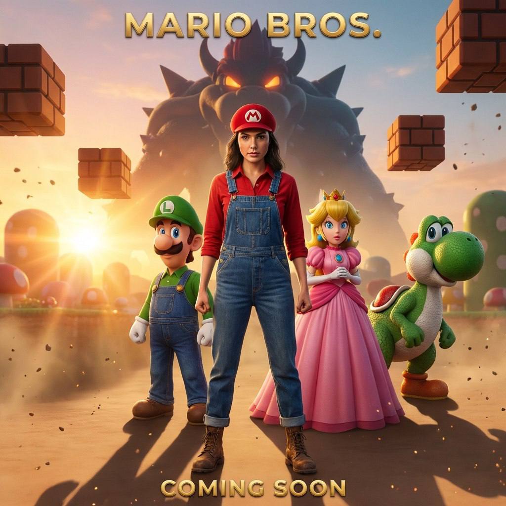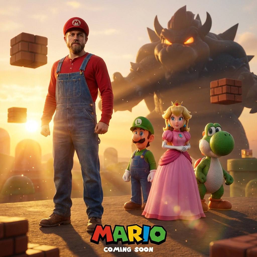 "Cinematic live-action movie poster featuring [Person from reference photo] dressed as a realistic Mario. Outfit: textured blue denim overalls with brass buttons, a high-quality red cotton shirt, and a red cap with an embroidered ""M"". Realistic leather work boots. Surroundings: High-fidelity CGI versions of Luigi, Princess Peach, and Yoshi standing next to him. They have realistic textures (skin pores, fabric, scales) but retain their cartoon shapes. Background: A hyper-realistic Mushroom Kingdom landscape at sunset. Floating brick blocks cast realistic shadows. In the distance, a massive, ominous silhouette of Bowser with glowing eyes. Lighting: Golden hour volumetric lighting, lens flares, dust particles. 8k, Unreal Engine 5 render, highly detailed."