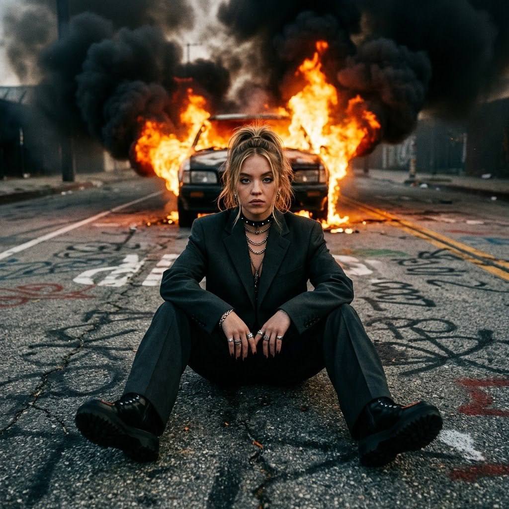 "Лицо оставить строго без изменений. Кинематографичная фотосессия в стиле dark cinematic, rebellion aesthetic и urban chaos с атмосферой опасной свободы, бунта и холодной уверенности. Сцена разворачивается на заброшенной дороге. На заднем плане — горящий автомобиль, охваченный ярким пламенем, из которого поднимается густой чёрный дым. Контраст огня и мрачной окружающей среды создаёт ощущение катастрофы, силы и полного контроля над хаосом. Настроение — дерзкое, анархичное, провокационное. Поза модели Модель сидит прямо на асфальте, широко расставив ноги. Колени согнуты, стопы уверенно упираются в землю. Корпус слегка наклонён вперёд, создавая ощущение доминирования и уверенности. Одна рука свободно лежит на колене, вторая — опирается о землю. Голова слегка наклонена в сторону, взгляд направлен прямо в камеру. Поза статичная, жёсткая, подчёркивающая внутреннюю силу и независимость. Образ модели Волосы собраны в небрежный хвост, отдельные пряди выбиваются и обрамляют лицо. Наряд — свободный тёмный костюм oversize (пиджак и брюки), создающий андрогинный и уличный образ. На ногах — грубые чёрные ботинки на массивной подошве. Аксессуары — цепи, кольца, чокер. Образ — городская бунтарка, икона силы и протеста. Атмосфера Напряжённая, мрачная, кинематографичная. Яркое пламя позади модели создаёт контровой свет и усиливает драму кадра. Асфальт с граффити, дорожной разметкой и трещинами добавляет урбанистической фактуры. Цветовая палитра — тёмно-серая, угольно-чёрная, с яркими оранжево-огненными акцентами. Ракурс и композиция Низкий ракурс. Камера расположена почти на уровне земли, направлена немного снизу вверх, усиливая эффект доминирования. Композиция центрированная: модель на переднем плане, горящая машина строго по центру за ней. Фокус на лице и позе, фон слегка размыт, но огонь остаётся выразительным. Обработка фотографии Кинематографичная цветокоррекция с холодными тенями и тёплыми огненными хайлайтами. Высокий контраст, глубокие тени, подчёркнутая текстура кожи, одежды и асфальта. Лёгкий эффект плёночного зерна и cinematic grit. Эффекты камеры Объектив 50 mm для усиления драматической перспективы. Диафрагма f/2.0–f/2.8. Основной свет — огонь сзади (контровой), дополнительный мягкий заполняющий свет спереди для лица. Эффект дыма, искр и тепловых волн. Высокое разрешение, стиль cinematic urban photography. Негативный промт: деформированное лицо, изменённая внешность, искажённые черты лица, низкое качество, нереалистичная кожа, нереалистичная модель, нарисованное фото, нереалистичное фото."