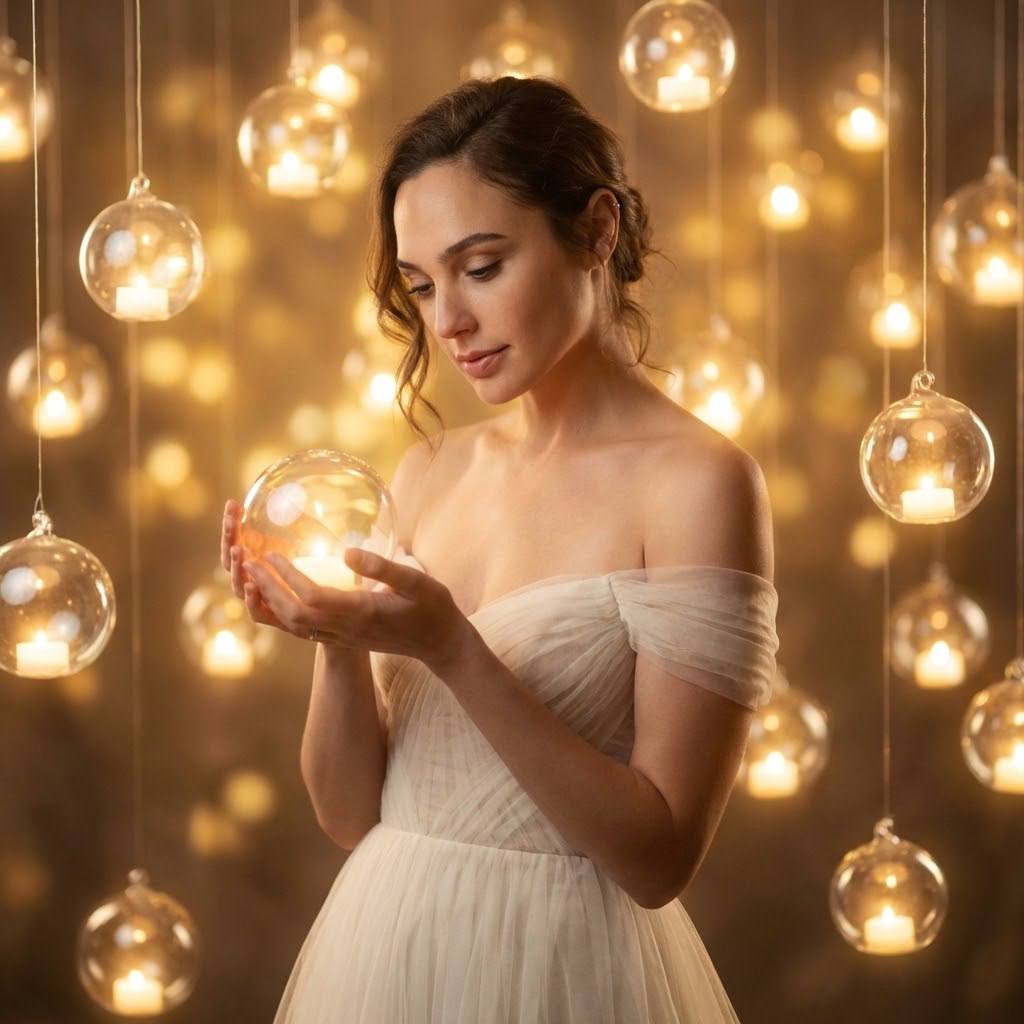"Лицо оставить строго без изменений. Художественная фотосессия в стиле dreamy fine art и сказочного света с атмосферой волшебного вечера и утончённой нежности. Пространство наполнено десятками подвесных стеклянных сфер с тёплым светом внутри, создающих эффект парящих огней и мягкого сияния. Фон растворяется в золотистом боке, формируя ощущение магии, тишины и камерного чуда. Настроение — спокойное, трепетное, поэтичное, словно момент исполнения желания. Поза модели Модель стоит, корпус слегка развёрнут в сторону. Обе руки приподняты перед собой и аккуратно держат одну светящуюся стеклянную сферу. Локти мягко согнуты, плечи расслаблены. Голова слегка наклонена вперёд. Взгляд направлен на шар в руках. Поза статичная, изящная, создающая ощущение бережного взаимодействия со светом. Образ модели Волосы уложены мягкими волнами, верхняя часть аккуратно собрана назад, открывая лицо. Наряд — светлое платье в оттенке айвори или шампанского с открытыми плечами и воздушной юбкой из тюля. Минимальные украшения, образ максимально чистый и романтичный. Образ — хранительница света, сказочная муза. Атмосфера Тёплая, волшебная, интимная. Светящиеся сферы окружают модель со всех сторон, создавая глубину и многослойность. Цветовая палитра — золотисто-медовая, кремовая, с мягкими бликами. В кадре ощущение тишины, уюта и магического спокойствия. Ракурс и композиция Средний портретный план по грудь. Камера расположена на уровне лица модели или чуть ниже. Композиция центрированная, модель окружена световыми элементами, создающими естественную рамку. Основной фокус — лицо и шар в руках, фон сильно размывается. Обработка фотографии Fine art обработка с тёплой цветокоррекцией. Мягкий контраст, подчёркнутый glow от источников света. Чистая кожа без пластиковой ретуши. Лёгкий эффект сказочного свечения и воздушного боке. Эффекты камеры Объектив 85 mm. Диафрагма f/1.8–f/2.0 для выраженного боке. Основной мягкий свет — от самих сфер, дополнительный заполняющий свет спереди для лица. Лёгкое плёночное зерно, высокая детализация, эффект dreamy cinematic portrait. Негативный промт: деформированное лицо, изменённая внешность, искажённые черты лица, низкое качество, нереалистичная кожа, нереалистичная модель, нарисованное фото, нереалистичное фото."