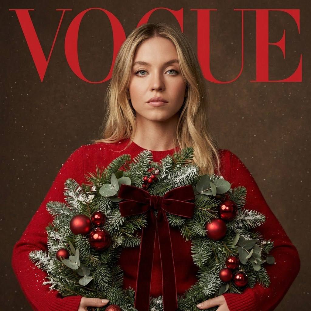 "KEEP ORIGINAL FACE 100% — the face must remain fully identical to the reference image. Preserve exact identity, facial structure, proportions, eyes, nose, lips, jawline, skin texture, and natural expression. The face must be clearly recognizable and match the reference exactly. Create an editorial fashion portrait in a magazine cover format. The model is centered in the frame, body slightly turned, head and gaze directed straight into the camera. In front of the model is a large, dense, voluminous Christmas wreath made of fir branches. The wreath includes red Christmas ornaments, pine needles, eucalyptus, decorative elements, and a dark red velvet ribbon, lightly dusted with snow. The wreath covers the lower part of the body; hands are partially visible, with one hand supporting the wreath from below. Look: a red long-sleeve knitted sweater, minimalist, without patterns. The look is warm, clean, and editorial. Background: a warm dark brown textured studio backdrop with a subtle snow-dust or grain effect, creating a vintage mood. Composition: vertical framing in a magazine cover layout, with a large red VOGUE logo at the top as a compositional element, clearly visible but not covering the face. Lighting: soft, warm, diffused studio light. The light highlights skin, fir texture, and red details of the wreath. No harsh shadows. Style: high-fashion editorial, Christmas cover aesthetic, vintage mood, ultra-realistic."