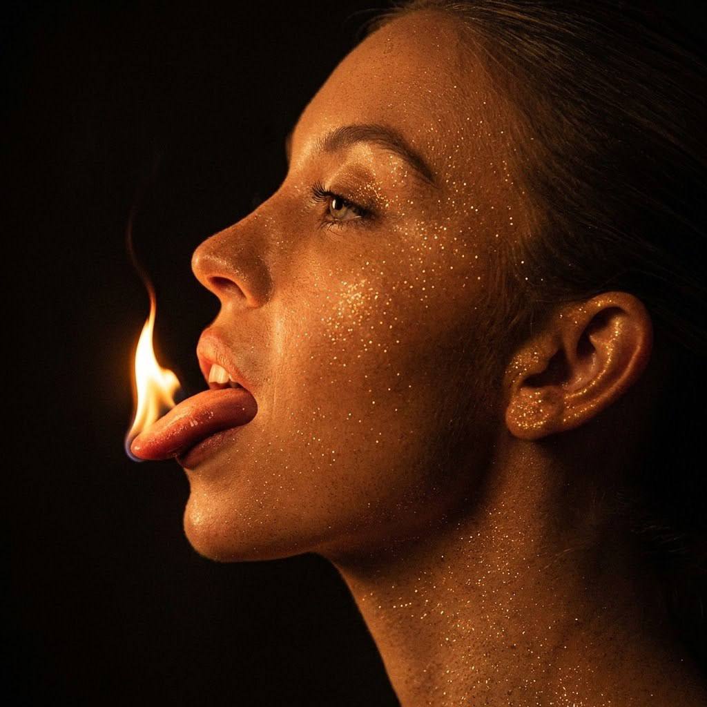 "Лицо оставить строго без изменений. Художественная арт-фотосессия в стиле dark fantasy и cinematic fire art с атмосферой первобытной силы, опасной чувственности и визуального гипноза. Настроение — магия огня, контроль над стихией, напряжённая эстетика запретного и завораживающего. Фон — глубокий чёрный или тёмно-графитовый, полностью лишённый деталей, чтобы подчеркнуть пламя и профиль лица. Поза модели Крайне крупный портрет в профиль. Голова развёрнута вбок, линия лица чётко читается. Рот приоткрыт, язык вытянут вперёд, на нем язычок пламени. Губы расслаблены, зубы слегка видны. Шея вытянута, подбородок немного приподнят. Поза статичная, выверенная, с ощущением полного контроля над моментом. Взгляд направлен вперёд или чуть вниз, не в камеру, создавая ощущение концентрации и транса. Образ модели Волосы гладкие, убраны назад или скрыты в тени, чтобы не отвлекать внимание от лица. Макияж художественный: кожа покрыта мельчайшими сияющими частицами (глиттер, shimmer), создающими эффект звёздной пыли. Образ — огненная жрица, мистическая муза, embodiment of fire. Атмосфера Интенсивная, тёмная, завораживающая. Чувствуется тепло, опасность и красота стихии. Настроение — магия, риск, абсолютный визуальный фокус. Кадр вызывает ощущение силы и притяжения. Ракурс и композиция Экстремально крупный план, профиль. Камера расположена на уровне лица. Кадр вертикальный. Лицо занимает почти весь кадр, пламя — ключевой визуальный акцент. Фон полностью уходит в темноту, усиливая драматизм. Обработка фотографии Контрастная cinematic-обработка. Тёплые золотые и оранжевые оттенки огня сочетаются с холодными тенями фона. Высокая детализация кожи, видимая текстура блёсток. Минимальная ретушь, подчёркнутая реалистичность огня. Глубокие тени, насыщенные света. Эффекты камеры Объектив макро-портретный. Диафрагма f/2.0–f/2.8. Основной источник света — пламя, создающее естественную тёплую подсветку лица. Дополнительный слабый заполняющий свет для сохранения деталей в тенях. Высокая выдержка для чёткости огня. Кинематографичный драматический свет. Негативный промт: деформированное лицо, изменённая внешность, искажённые черты лица, низкое качество, нереалистичная кожа, нереалистичная модель, нарисованное фото, нереалистичное фото."