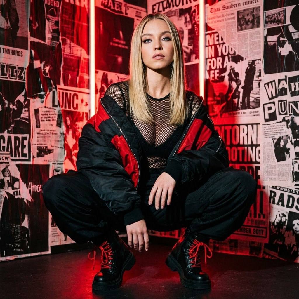 "Лицо оставить строго без изменений. Дерзкая fashion-фотосессия в урбанистическом, бунтарском стиле с мощной энергетикой силы и уверенности. Атмосфера — тёмный неон, street-couture, эстетика андеграундной моды и музыкального альбома. Пространство наполнено агрессией цвета, контрастом и ощущением манифеста. Фон — коллаж из рваных постеров, газетных вырезок и типографских элементов, создающих хаотичную, протестную визуальную среду. Поза модели Модель находится в глубоком приседе с широко расставленными ногами, опираясь на пол всей стопой. Один локоть упирается в колено, рука свободно свисает вниз, пальцы расслаблены. Вторая рука опирается на другое колено, создавая устойчивую, приземлённую позу. Корпус слегка наклонён вперёд, плечи раскрыты. Голова приподнята, подбородок чуть выдвинут вперёд. Взгляд направлен прямо в камеру. Поза подчёркивает силу, контроль и внутреннюю мощь. Образ модели Прямые волосы с ровной укладкой и чётким пробором, гладкая текстура с лёгким глянцем. Наряд — чёрный топ с полупрозрачной сеткой в зоне декольте, подчёркивающий грудь и пресс. Объёмная чёрная куртка-бомбер с красными вставками, небрежно спущенная с плеч. Чёрные свободные брюки в стиле streetwear. Массивные чёрные ботинки на толстой подошве с яркими красными шнурками. Образ — сильная urban-икона, street queen, символ независимости и власти. Атмосфера Жёсткая, напряжённая, провокационная. Доминирующий красный цвет создаёт ощущение опасности, страсти и протеста. В кадре чувствуется энергия ночного города, музыка, шум, манифест личности. Это не гламур, а сила и характер. Ракурс и композиция Средний план с захватом фигуры полностью. Камера расположена чуть ниже уровня глаз модели, создавая эффект доминирования и визуального превосходства. Вертикальная композиция. Модель расположена по центру кадра, фон плотно заполняет пространство, усиливая эффект давления и глубины. Акцент на лице, позе и массивной обуви. Обработка фотографии Контрастная, кинематографичная обработка. Доминирующий красный цвет с глубокими чёрными тенями. Тёплый красный свет сочетается с приглушёнными тёмными оттенками кожи. Высокий контраст, подчёркнутая текстура кожи, ткани и фона. Зернистость в стиле плёночной фотографии. Эффекты камеры Объектив 50 mm для усиления присутствия и динамики. Диафрагма f/1.8–f/2.2. Жёсткий направленный свет сверху и сбоку, создающий драматичные тени. Дополнительная красная подсветка фона. Плёночное зерно, эффект музыкального постера или обложки альбома. Негативный промт: деформированное лицо, изменённая внешность, искажённые черты лица, низкое качество, нереалистичная кожа, нереалистичная модель, нарисованное фото, нереалистичное фото."