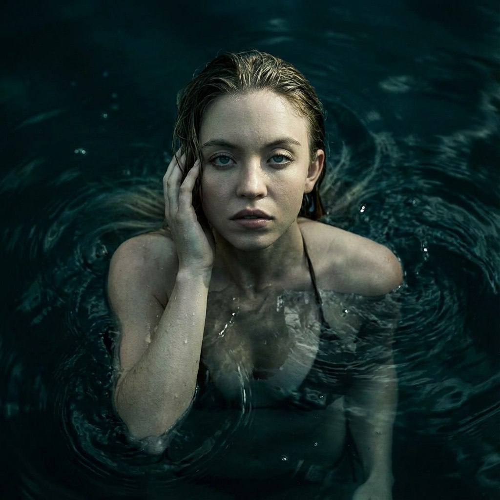 " Сделай фото по моему селфи, сохрани мою естественную внешность и естественную асимметрию лица. Поза и композиция Вид строго сверху (top-down), крупный план: голова и верх плеч над водой. Я стою в воде , тело под поверхностью в большой глубине. Я запрокинув голову смотрю наверх в камеру, касаясь рукой лица или волос, будто только что вынырнула. Голова не касается воды. Вода почти черная , дна не видно и тела почти тоже, оно скрыто водой. Поза естественная без артефактов рук и изящная. Взгляд в камеру, выражение напряжённо-спокойное. Вокруг головы и шеи и рук плотная рябь и завихрения, вода “живая”. На лице видны капли воды, высокая детализация Телосложение Худое, аскетичное, плечи стандартной ширины (не узкие), длинные тонкие конечности. Одежда Тело скрыто толщей воды; без акцента на теле. Раздельный купальник на завязках может угадываться едва едва. Без обнажения. Причёска Мокрые волосы приглажены водой, часть прядей уходит под поверхность. Свет Контрастный направленный свет сверху-сбоку: лицо подсвечено, вокруг глубокие cinematic shadows. На воде мелкие блики без пересветов, холодная зелёно-синяя тональность, премиальный editorial feel. Экспозиция низкая. Камера 50mm, вид сверху, без широкоугольных искажений; фокус на глазах, высокая детализация воды. Негативный промпт Не менять лицо и асимметрию; без морфинга/усреднения/face swap, не менять возраст. Без wide-angle. Без лишних конечностей/деформаций рук. Без видимых бортиков бассейна/плитки/посторонних объектов, без текста/логотипов/водяных знаков, без CGI/мультяшности.Без повышенной экспозиции"