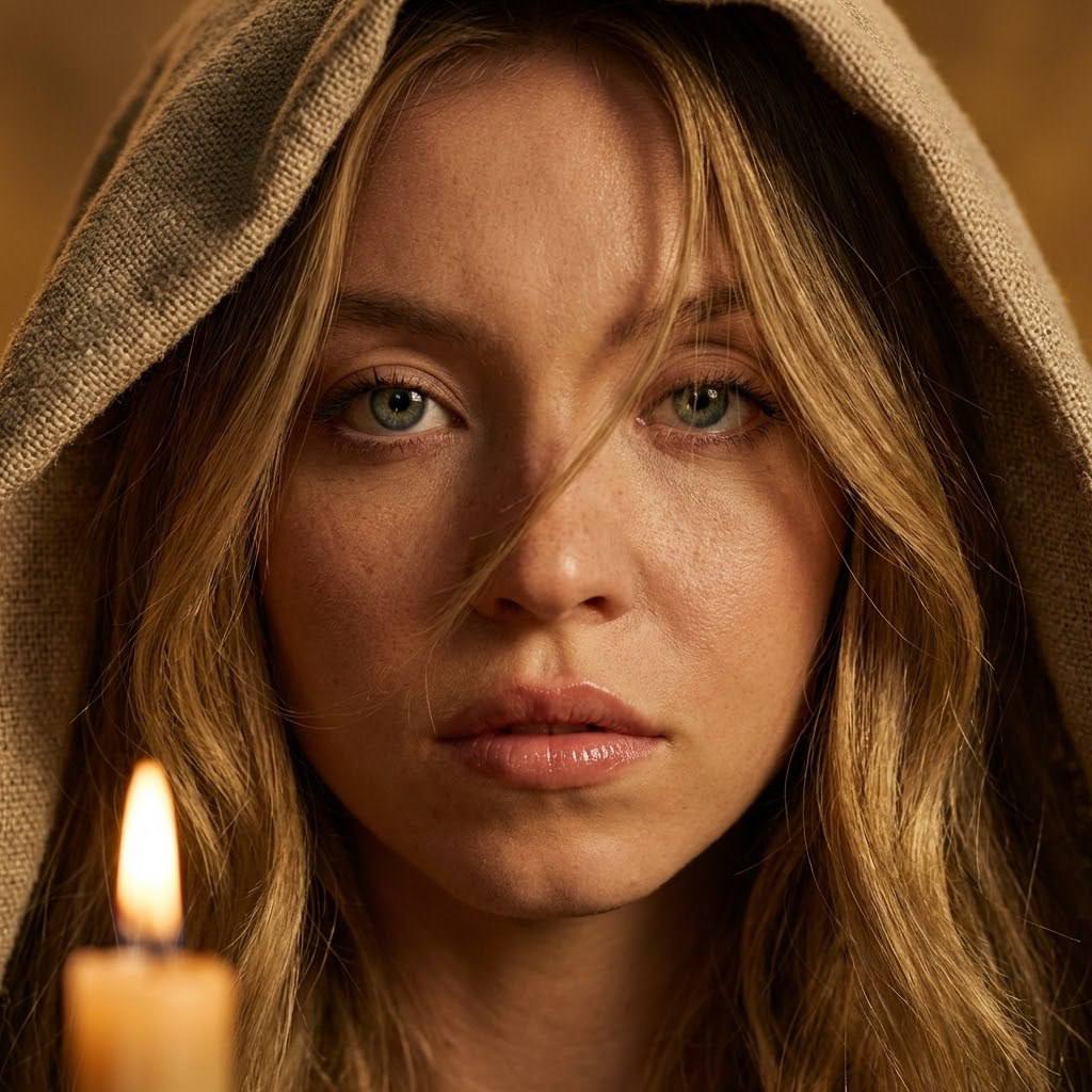 "Сделай реалистичное фото по селфи, максимально сохраняя внешность с моего фото: те же черты лиц, пропорции, природную асимметрию, форму и цвет глаз, бровей и губ, форму носа и скул, текстуру кожи, линию роста волос, причёски; не меняй возраст и телосложение мужчина — не худой телосложения. Человек на фото должен соответствовать 1:1 как на моем фото, не меняй лицо, не меняй черты и физиологию. Сгенерируй гиперреалистичный портрет макро съемка крупным планом: лицо девушки с моего фото занимает почти весь кадр, камера расположена в непосредственной близости, что позволяет детально рассмотреть текстуру кожи и мельчайшие детали. Рукурс девушки: - взгляд направлен прямо в объектив камеры, пронзительный, с лёгкой напряжённостью и загадочностью; - лицо частично скрыто тканью, которая обрамляет верхнюю часть головы и частично закрывает лоб, создавая эффект таинственности; - пряди волос небрежно спадают на лицо, частично закрывая глаз, что добавляет драматизма; - губы слегка приоткрыты, подчёркивая эмоциональность образа; - выражение лица сочетает спокойствие и внутреннюю силу. Детали внешности: - кожа с естественным сиянием, детально проработанная: видны веснушки, поры, лёгкая текстура; - глаза выразительные, с насыщенным цветом радужки, длинные густые ресницы подчёркивают взгляд; - брови чётко очерчены, естественные, с лёгкой асимметрией; - губы пухлые, с естественным блеском, слегка увлажнённые. Ключевые элементы композиции: - в левом нижнем углу кадра — размытое изображение пламени свечи, создающее тёплый световой акцент и атмосферу уюта, загадочности; - ткань, обрамляющая лицо, выполнена из грубого материала (напоминает мешковину или лён), с видимой текстурой переплетения нитей; - игра света и тени на лице подчёркивает рельеф скул, носа, губ. Освещение: - тёплый, мягкий свет с золотистым оттенком, имитирующий свет от свечи; - свет падает под углом, создавая глубокие тени на одной стороне лица и подчёркивая детали на другой; - блики на коже и губах выглядят естественно, с лёгким мерцанием. Фон: - фон размытый, без чётких деталей, выполнен в тёплых коричнево-золотистых тонах, не отвлекает внимание от основного объекта; - плавные переходы оттенков создают эффект боке, усиливая фокус на лице модели. Дополнительные эффекты: - лёгкая дымка или вуаль света в верхней части кадра, создающая ощущение воздушности; - высокая детализация изображения — видны отдельные волоски, текстура кожи, волокна ткани; - глубина резкости минимальна, что подчёркивает фокус на лице и размывает фон и периферийные элементы. Качество изображения: - разрешение 8K, с высокой резкостью и глубиной цвета; - цветопередача тёплая, с акцентом на золотисто-коричневую гамму; - баланс контраста и яркости создаёт кинематографический эффект. Общий стиль: - драматичный, с элементами арт-фотографии; - сочетание интимности крупного плана, тёплого освещения и загадочности частично скрытого лица создаёт мощный эмоциональный эффект. НЕГАТИВНЫЙ ПРОМПТ Не менять пропорции и черты лица, не корректировать природную асимметрию. Не искажай части тела и анатомию человека, не удлиняй сильно пальца. Исключить пластиковую кожу, переретушь, неестественный блеск. Не допускать анатомических ошибок (лишние пальцы, искажения шеи/плеч). Избегать артефактов, CGI, мультяшности, пересвета. Не добавлять посторон