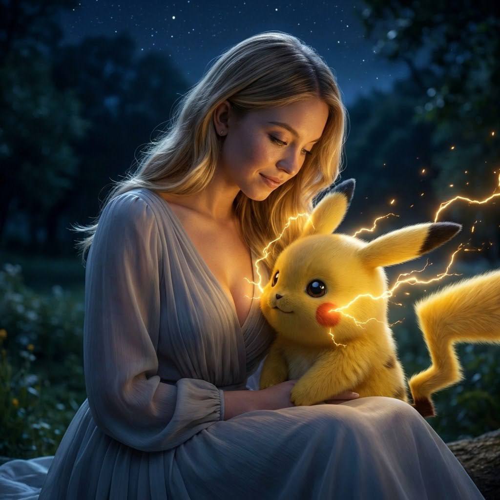 "Фотореалистичная ночная сцена Кино атмосферой. Девушка и Пикачу находятся вместе в кадре под открытым ночным небом. Композиция средняя или крупная (по пояс): девушка в центре, Пикачу рядом с ней, слегка впереди или у неё на руках. Кадр построен так, чтобы взаимодействие и световые эффекты были главным фокусом. Внешность девушки сохранена 1-в-1 по исходному фото: черты лица, природная асимметрия без изменений. Без морфинга и ретуши. Лицо чётко читается в ночном свете. Телосложение и рост Девушка высокая, рост 178 см, телосложение худое, аскетичное, с длинными конечностями. Пропорции утончённые и естественные, подчёркнутые позой и светом. Пикачу (реалистичный, ночной образ) Пикачу изображён как живое, фотореалистичное фантазийное существо для кино: детализированная мягкая шерсть, естественные пропорции тела, выразительные глаза с отражением электрического света. Он выглядит тёплым, живым, эмоциональным — не игрушка и не мультяшный персонаж. От его щёк исходят мягкие электрические разряды. Взаимодействие и эмоция Пикачу слегка прижимается к девушке или стоит рядом, подняв лапки. Девушка смотрит на него или опускает взгляд в его сторону. Между ними ощущение доверия, уюта и дружеской связи. Электрические эффекты (ключевой акцент) От щёк Пикачу исходят мягкие электрические искры: тонкие, светящиеся разряды жёлто-золотого цвета. Искры не агрессивные, а тёплые и магические, мягко освещают лица, руки и окружающее пространство. Лёгкое свечение вокруг персонажей(Киношное). Одежда и образ девушки Ночной, нежный образ: однотонная одежда спокойного оттенка (молочный, светло-бежевый, пастельно-серый или мягкий голубой). Ткань струящаяся, без лишних деталей, подчёркивающая атмосферу сказки и не отвлекающая внимание от сцены. Свет, фон и атмосфера Ночное освещение с мягким холодным фоновым светом (луна, ночное небо) и тёплыми акцентами от электрических искр Пикачу. Фон слегка размытый: ночной лес, парк или природный ландшафт с глубокими синими и тёмно-зелёными оттенками. Атмосфера уютная, ностальгическая. Фотореализм, высокая детализация, качество 8K. Негативный промпт Игрушка, плюшевая текстура, мультяшность, карикатурность, иллюстрация, CGI, 3D, жёсткие агрессивные молнии, неестественные пропорции Пикачу, изменение внешности девушки, изменение телосложения или роста, морфинг лиц и тел, ретушь кожи, бьюти-фильтры, пересвет, wide-angle, fish-eye, искажения перспективы, текст, логотипы, водяные знаки, шум, артефакты."