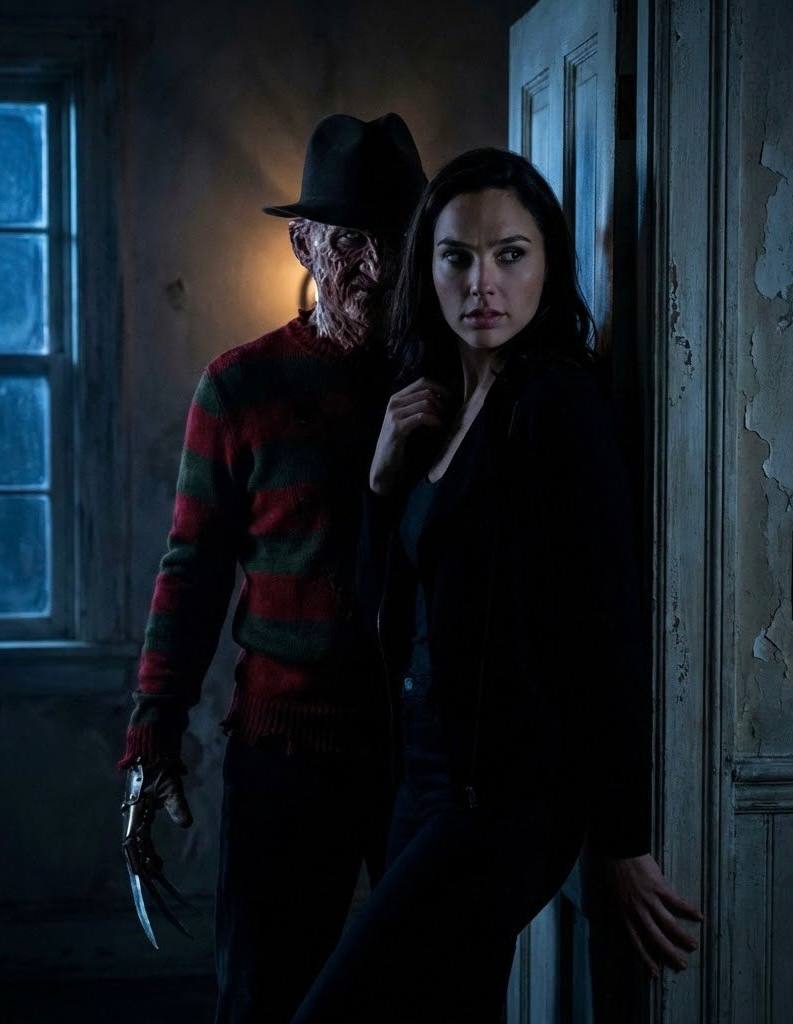 " Сюжет и композиция Фотореалистичная хоррор-сцена, выглядящая как кадр из кинофильма. Ночной интерьер старого дома. Девушка стоит на переднем плане в полоборота к камере. Позади неё, в глубине кадра, почти сливаясь с тенью, стоит Фредди Крюгер. Композиция выстроена так, что зритель сначала видит девушку — и только через мгновение замечает его силуэт. Внешность девушки сохранена 1-в-1 по исходному фото: черты лица, природная асимметрия без изменений. Без морфинга и ретуши. Телосложение и рост Девушка высокая, рост 178 см, телосложение худое, аскетичное, с длинными конечностями. Фигура вытянутая, подчёркнутая перспективой и светом. Поза и состояние девушки Девушка стоит напряжённо, словно чувствует чьё-то присутствие, но ещё не обернулась. Плечи слегка приподняты, дыхание будто задержано. Взгляд направлен в сторону или вниз, выражение тревожное, сдержанное, без крика — страх внутренний. Фредди Крюгер (реалистичный кино-образ) Фредди Крюгер изображён максимально реалистично, как живой актёр в кино: обгоревшая, неровная кожа лица с естественной текстурой, тёмная шляпа, полосатый свитер, перчатка с металлическими лезвиями. Он стоит неподвижно, слегка наклонив голову. Его лицо частично скрыто тенью, виден лишь один глаз и контур ухмылки. Не карикатура, не грим, а пугающе реальный человек. Взаимодействие и напряжение Фредди находится слишком близко, нарушая личное пространство, но не касается девушки. Лезвия перчатки отражают слабый свет. Между персонажами ощущается плотное напряжение — момент до действия. Локация и окружение Старая комната или коридор: облупленные стены, дверной проём, тусклый свет из соседнего помещения. Глубокие тени в углах, пространство кажется реальным, жилым, но заброшенным. Свет и атмосфера Кинематографичное ночное освещение. Холодный синий свет с одной стороны и слабый тёплый контровой свет сзади Фредди. Свет подчёркивает текстуру кожи, ткани и металла, создаёт длинные тени. Атмосфера гнетущая, тревожная, ощущение неминуемой опасности. Фотореализм, высокая детализация, качество 8K. Негативный промпт Кровь, расчленёнка, гротеск, мультфильм, иллюстрация, CGI, 3D, карикатурность, дешёвый хоррор-грим, скример-эффект, изменение внешности девушки, изменение телосложения или роста, морфинг лица и тела, ретушь кожи, бьюти-фильтры, wide-angle, fish-eye, цифровой шум, артефакты, текст, логотипы, водяные знаки, мешки под глазами, тёмные круги, синяки, запалые глаза у мужского персонажа."