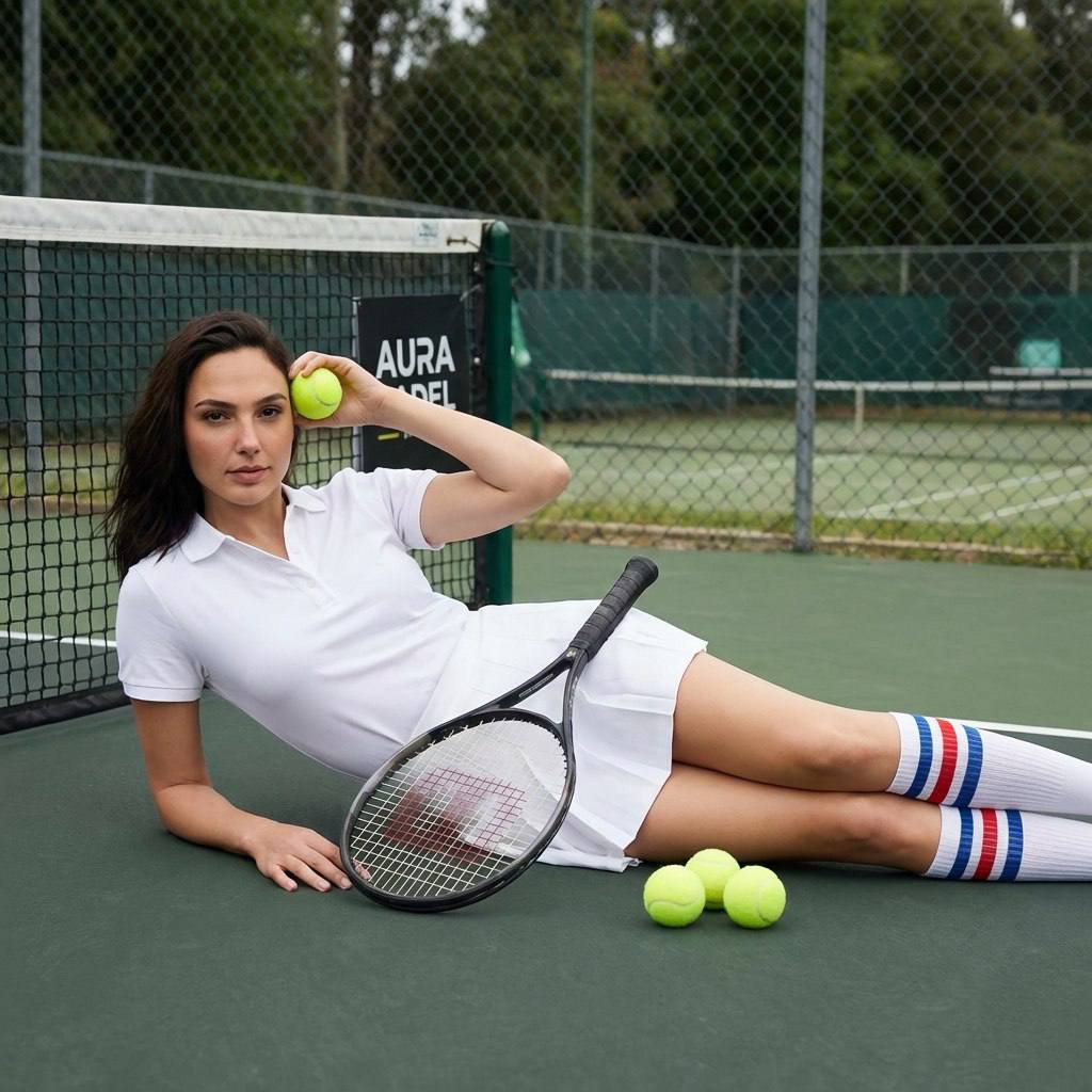 "Сделай ультра реалистичное фото по моему селфи, максимально сохраняя мою внешность: мои черты лица, пропорции, природную асимметрию, форму и цвет глаз, бровей и губ, цвет и текстуру кожи, цвет и структуру волос; не меняй мой возраст и тип фигуры, не выравнивай и не «улучшай» лицо, soft skin realism. Выражение лица как на фото. Создай фотографию в стиле спортивной фотосессии на теннисном корте. На переднем плане — человек в классической теннисной форме (белая юбка, белая рубашка с короткими рукавами, полосатые гольфы). Он лежит на боку на теннисном покрытии, опираясь на одну руку, другая рука поднята и согнута в локте, кисть расположена у головы. Телосложение: худое телосложение. Рядом с человеком: - теннисная ракетка, лежащая на юбке; - четыре теннисных мяча, три из которых расположены рядом друг с другом, а четвёртый — чуть в стороне, в руке у человека. - пол корта темно-зеленого цвета Фон: - сетка для падела с логотипом «AURA PADEL» в верхней части кадра, близко за спиной у девушки; - за сеткой — ограждение корта и размытый фон с деревьями и элементами спортивной инфраструктуры яркого насыщенного зеленого цвета. Освещение: естественное, мягкое, с лёгкой тенью, подчёркивающее детали формы и инвентаря. Композиция горизонтальная, с акцентом на расслабленную позу человека и спортивный антураж. Атмосфера спокойная, с элементами спортивной эстетики. Фокус чёткий на человеке и инвентаре, фон слегка размытый. НЕГАТИВНЫЙ ПРОМПТ: не менять мои черты лица и природную асимметрию, не менять цвет и длину волос, не менять возраст, без пластиковой кожи и сильной ретуши, без искажений тела, без лишних рук/пальцев, без склеивания, без кривых пропорций, без грязных артефактов, без мультяшности, без чрезмерного HDR, без кислотных цветов, без текста и логотипов, без лишних людей в кадре"