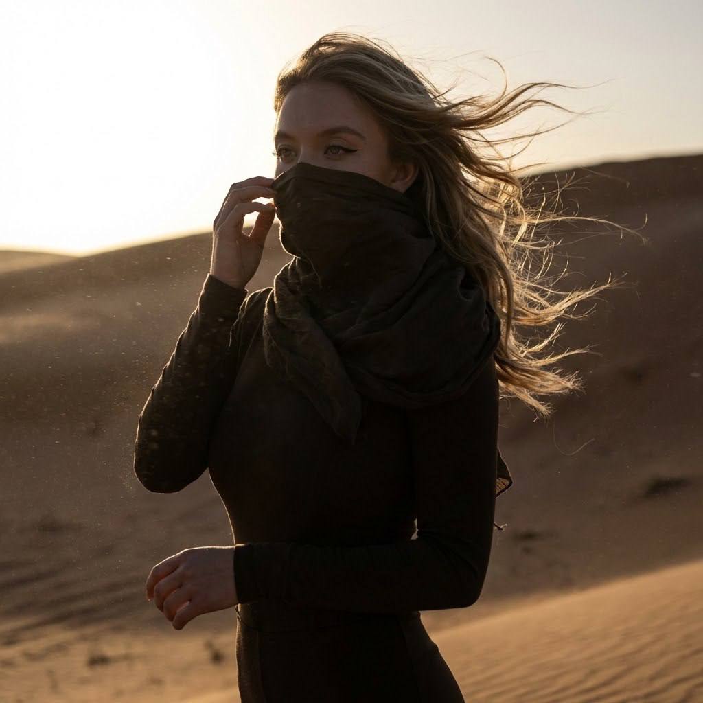 "Photo of the same person from the uploaded image. Same head tilt and gaze direction. Natural appearance, no stylization. Natural facial asymmetry must remain unchanged. Makeup: natural glossy lips with light shine, subtle eyeliner with soft minimal wings, original eyelashes as in the source photo. ТЕЛОСЛОЖЕНИЕ: худое, аскетичное, длинные тонкие конечности. Pose: standing or slight half-turn, torso slightly turned 3/4; one hand lifts and holds the face scarf near the cheek as if adjusting it against strong wind, fingers separated; the other arm relaxed down. Hair: strong wind, hair actively blowing back and sideways, dynamic motion. Clothing: dark desert outfit with long sleeves, fitted silhouette, lightweight fabric. Face covering: dark sand scarf/veil covering the lower half of the face (nose and mouth), wrapped securely, leaving only the eyes visible. Scene: dark cinematic desert at sunset, high sand dunes, no vegetation, no grass, no buildings. Large amounts of sand and dust in the air, sand particles flying through the frame, stormy atmosphere. Lighting: strong backlight from the low sun, face partially in shadow, natural contrast, deep shadows, pronounced rim light on hair, scarf, and shoulders. Camera: 50–85mm lens, eye-level, slight 3/4 angle, close-to-medium framing, no wide-angle distortion. Negative prompt: do not change facial asymmetry, do not change jaw shape or jawline, no face reshaping, no idealized beauty face, no plastic skin, no extra arms/hands/fingers, no fused fingers, no broken anatomy, no CGI/cartoon look, no text, logos, or watermarks."