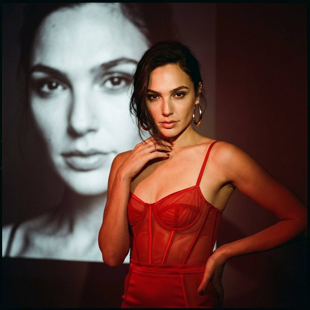 "СОХРАНИТЬ РЕАЛЬНОЕ ЛИЦО — строго сохранить точные черты лица и идентичность с референсного изображения. Без бьютификации, без стилизации. Студийная fashion-фотосессия в стиле драматического гламура с атмосферой кинематографической чувственности и эстетики «роковая женщина». Фон тёмный, нейтральный, с проекцией крупного портрета модели на задней стене, создающей эффект двойного образа и визуальной глубины сцены. В кадре ощущение сцены, театральности и внутреннего напряжения. Поза модели Модель стоит прямо, корпус слегка развёрнут к камере. Одна рука поднята к груди, пальцы мягко касаются ключицы. Вторая рука опущена вниз и лежит на бедре. Плечи расправлены, талия подчёркнута. Голова слегка наклонена вперёд, взгляд направлен в объектив. Волосы частично закрывают одну сторону лица, создавая эффект небрежной сексуальности. Поза статуарная, с акцентом на изгибы фигуры и линию шеи. Образ модели Прямые волосы, уложенные с эффектом лёгкого беспорядка. Крупные золотые серьги-кольца. Наряд — красное корсетное платье с полупрозрачными вставками и тонкими бретелями, подчёркивающее грудь, талию и бёдра. Образ — гламурная дива в стиле high fashion и Hollywood noir. Атмосфера Драматичная, чувственная и кинематографичная. Настроение — сила и уверенность в себе. Проекция портрета на фоне усиливает эффект внутреннего диалога и художественного контраста между реальной фигурой и увеличенным изображением лица. Ракурс и композиция Средний план по колени. Камера расположена на уровне груди модели. Модель размещена по центру кадра. Проекционный портрет занимает верхнюю часть фона и создаёт визуальную рамку вокруг фигуры. Композиция вертикальная, с чётким разделением фона и переднего плана. Фокус на лице и линии тела. Обработка фотографии Контрастная кинематографическая цветокоррекция с доминированием тёплого красного и глубоких тёмных оттенков. Мягкое освещение на коже с сохранением текстуры. Глубокие тени, подчёркивающие форму фигуры и складки платья. Лёгкий эффект плёночной мягкости без потери резкости. Эффекты камеры Объектив 85 mm. Диафрагма f/2.8 – f/3.5 для отделения модели от фона. Основной направленный свет спереди и сверху, формирующий мягкий овал света на теле. Дополнительный свет на фон для проекции изображения. Минимальный заполняющий свет по бокам для усиления драматических теней. Лёгкое плёночное зерно для эффекта художественного портрета. Негативный промт: деформированное лицо, изменённая внешность, искажённые черты лица, низкое качество, нереалистичная кожа, нереалистичная модель, нарисованное фото, нереалистичное фото."