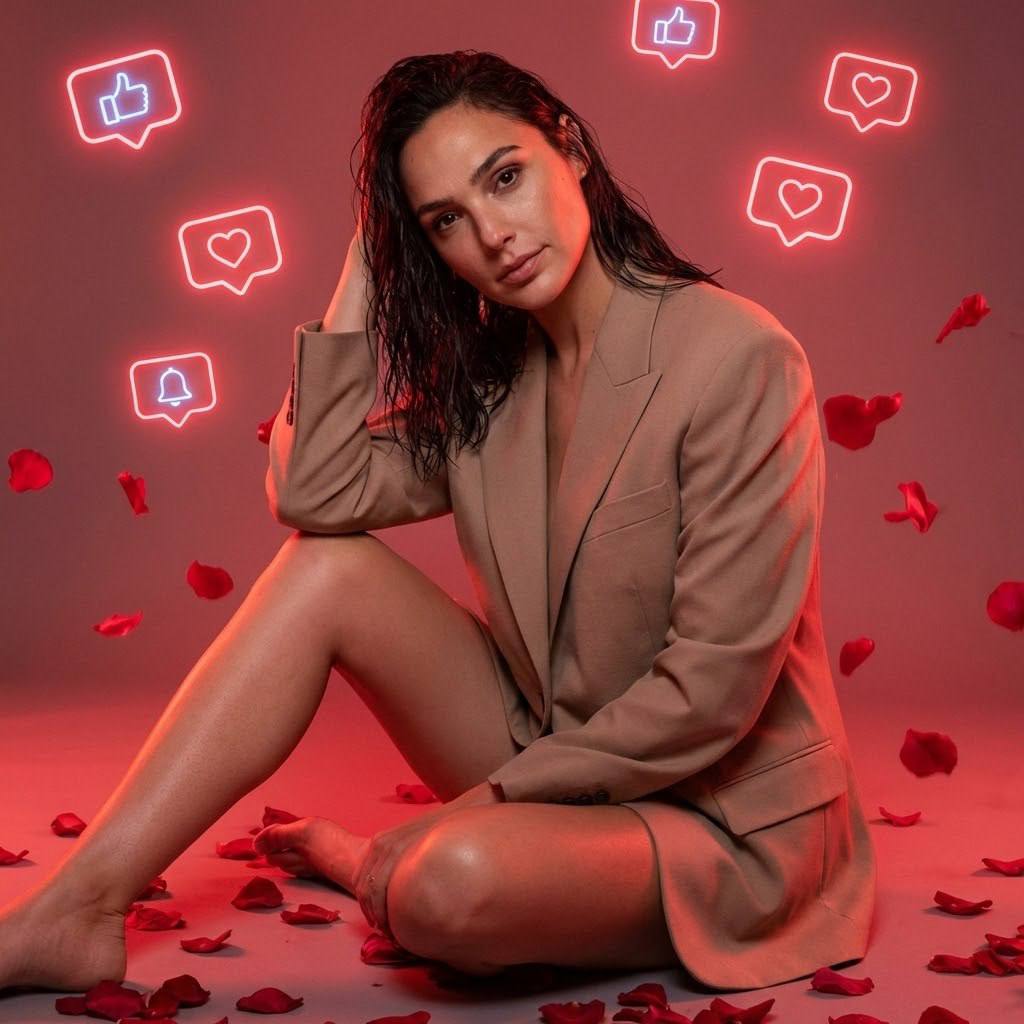 " СОХРАНИТЬ РЕАЛЬНОЕ ЛИЦО — строго сохранять точные черты лица и идентичность с референсным изображением. Без бьютификации, без стилизации. Фотосессия в современном digital-стиле с атмосферой неоновой романтики и социальных медиа. Пространство наполнено мягким красным свечением, вокруг модели — неоновые иконки реакций и уведомлений, создающие эффект виртуального внимания и эмоциональной вовлечённости. В воздухе и на полу разбросаны лепестки роз, усиливающие чувственное настроение и визуальную динамику кадра. Поза модели Модель сидит на полу в расслабленной, уверенной позе. Одна нога согнута, вторая лежит свободно, формируя диагональную линию композиции. Одна рука опирается на колено, пальцы расслаблены, вторая рука лежит на полу возле бедра. Корпус слегка повернут к камере. Спина прямая, плечи расслаблены. Голова немного наклонена, взгляд направлен прямо в объектив. Образ модели Влажные текстурные волосы с эффектом лёгкой небрежности. Свободный бежевый жакет, надетый как платье, создаёт баланс между строгостью и чувственностью. Образ — уверенная digital-муза, сочетающая моду и современную визуальную культуру. Атмосфера Неоновое красное свечение создаёт интимное, эмоциональное настроение. Лепестки роз добавляют романтичную символику. Общая атмосфера — смесь чувственности, современности и эстетики социальных сетей, ощущение виртуального признания и внимания. Ракурс и композиция Средний портретный план с захватом фигуры в сидячей позе. Камера расположена чуть ниже уровня глаз для подчёркивания уверенности и формы тела. Модель — центр композиции, неоновые элементы образуют визуальную рамку вокруг неё. Лепестки на переднем плане добавляют глубину. Обработка фотографии Чистая студийная цветокоррекция с акцентом на красные неоновые оттенки. Контраст мягкий, кожа реалистичная, без пластиковой ретуши. Подсветка подчёркивает объём фигуры и текстуру ткани. Эффекты камеры Объектив 50 mm для естественной перспективы. Диафрагма f/2 – f/2.8 для мягкого отделения от фона. Неоновый контровой свет + мягкий фронтальный заполняющий свет. Лёгкое свечение вокруг неоновых элементов и минимальная кинематографичная зернистость. Негативный промт: деформированное лицо, изменённая внешность, искажённые черты лица, низкое качество, нереалистичная кожа, нереалистичная модель, нарисованное фото, нереалистичное фото"