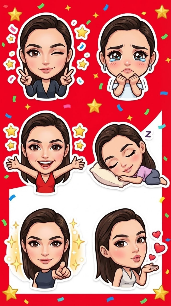 "Использовать прикреплённое фото как основной референс лица. Строго сохранить идентичность человека: форму лица, пропорции, черты, расстояние между глазами, форму носа, губ, бровей, подбородка, выражение кожи. Не изменять лицо, не заменять персонажа, не стилизовать черты. Создать серию поз и выражений с тем же персонажем: – Игриво показывает знак мира обеими руками и подмигивает – Заплаканные глаза и слегка дрожащие губы, милое выражение плача – Широко распахнутые объятия в тёплой, восторженной позе – Лежит на боку и спит, положив голову на маленькую подушку, с мягкой улыбкой – Уверенно указывает вперёд, окружённый сияющими визуальными эффектами – Посылает воздушный поцелуй, вокруг которого летают символы сердечек Стиль: chibi aesthetic, но с сохранением реальных черт лица из референса. Глаза увеличенные и выразительные, но форма, посадка и направление взгляда соответствуют референсу. Мягкие черты, аккуратные линии, естественные эмоции. Фон: ярко-красный, с элементами звёзд или разноцветного конфетти. Оставить немного чистого белого пространства вокруг каждой наклейки. Соотношение сторон: 9:16 Качество: чистое, аккуратное, без искажений лица. NEGATIVE PROMPT: другое лицо, изменение идентичности, другая форма глаз, другой нос, другой подбородок, лицо не похоже на референс, аниме-рандом, чужой персонаж, сильная стилизация лица, искажения, асимметрия, лишние черты, плохие руки, размытие, low quality"