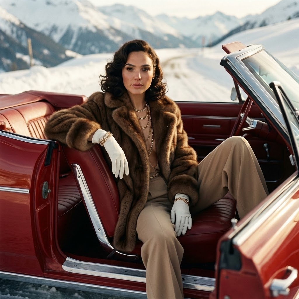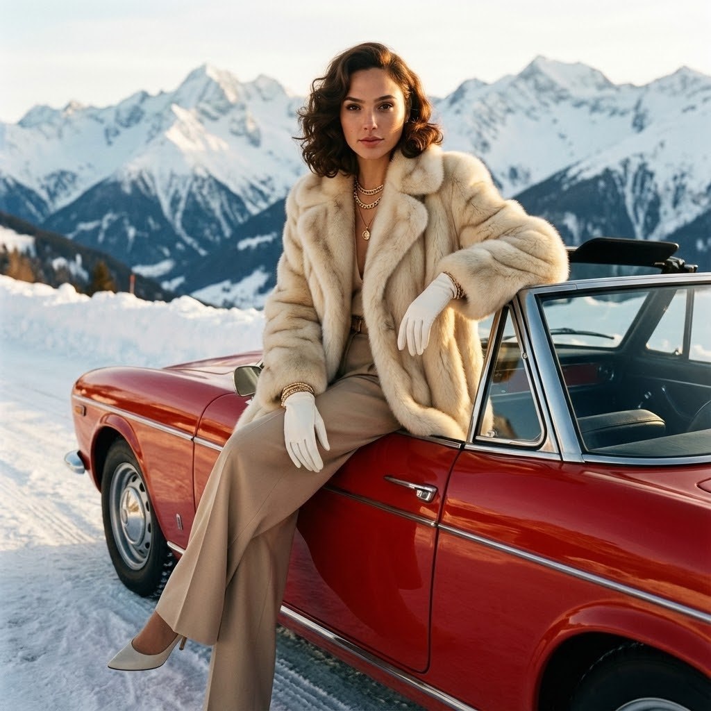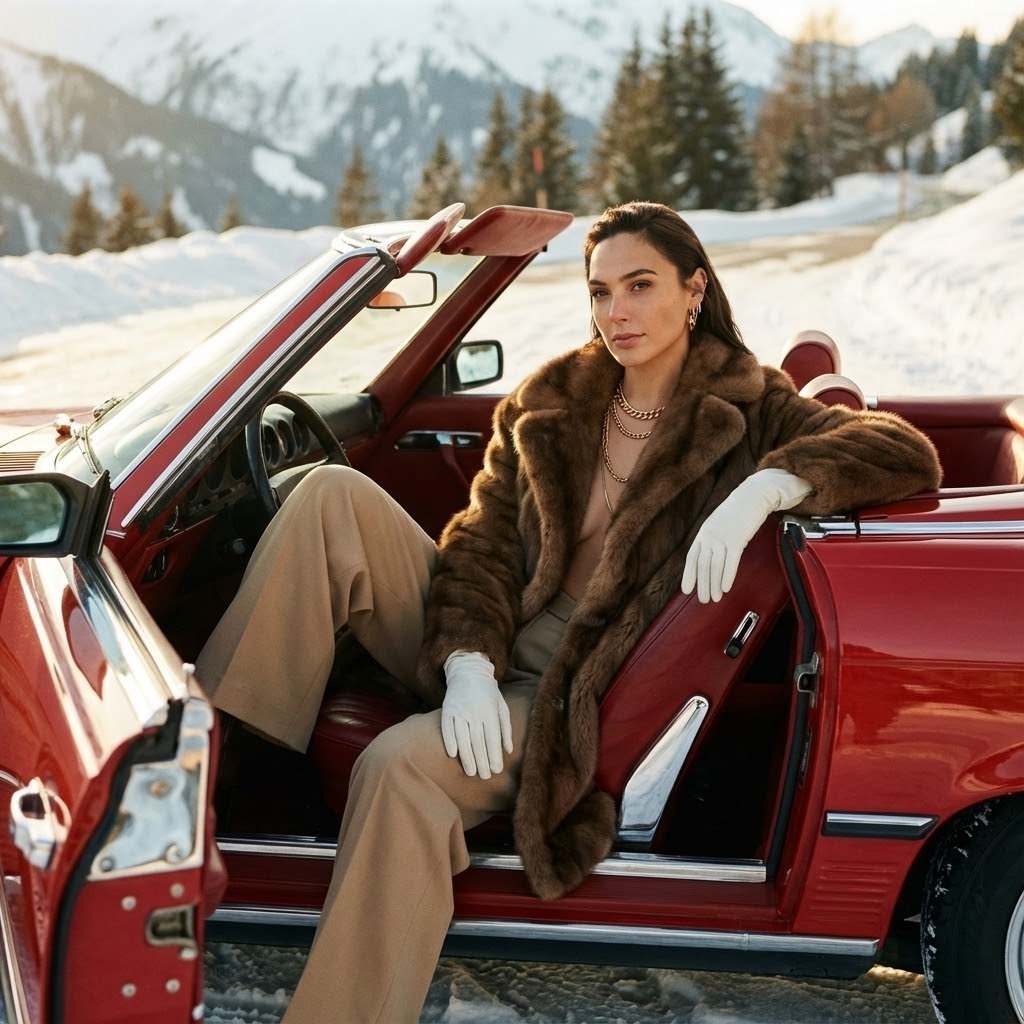 "Основная задача Сделай ультрареалистичное редакционное fashion-фото строго по прикреплённому фото. СТРОГО сохранить внешность девушки 1-в-1: лицо, кожу, пропорции тела, природную асимметрию, черты лица, форму глаз, носа и губ, линию роста волос — без каких-либо изменений. Использовать прикреплённое фото как эталон. Без морфинга, усреднения, face swap и изменения возраста. Ракурс и композиция Съёмка в полный рост / по пояс (в зависимости от исходного кадра), камера на уровне корпуса. Композиция стабильная, редакционная, без динамических искажений. Глубокий фокус, читаемый фон. Поза и действие Девушка находится у ярко-красного винтажного кабриолета. Дверь автомобиля закрыта, окно опущено. Она сидит на верхнем крае закрытой двери. Корпус слегка развёрнут к камере. Одна нога вытянута немного вперёд, вторая ближе к двери. Ноги находятся снаружи автомобиля. Одна рука лежит на верхнем крае двери, вторая опущена на ногу. Поза расслабленная, устойчивая, естественная, без модельного позирования. Внешность (лицо, волосы, макияж) Лицо, мимика и пропорции полностью идентичны фото-референсу. Мягкие винтажные локоны в эстетике 1980-х. Без изменения макияжа и выражения лица. Одежда и аксессуары Кремовая шуба из коричневого меха, надета нараспашку. Широкие бежевые брюки. Белые перчатки. Золотые многослойные украшения. Материалы выглядят дорогими и реалистичными, с правильной посадкой и складками. Фон и окружение Заснеженная альпийская дорога. На фоне — заснеженные горы Куршевеля. Окружение чёткое, без размытия фона, глубокий фокус. Свет Золотой час. Тёплый боковой закатный свет. Мягкие тёплые блики на мехе, коже, волосах и кузове автомобиля. Естественные, кинематографические тени. Камера и стиль Гиперреалистичная редакционная fashion-фотография. Стиль ретро 1980-х. Плёночная зернистость. Насыщенные, глубокие цвета. Кинематографический винтажный шик. Негативный промпт не менять лицо, черты, пропорции тела и природную асимметрию; без морфинга, усреднения, face swap; без изменения позы, положения ног, рук и двери автомобиля; без открытой двери; без деформаций тела и одежды; без лишних конечностей или искажённых рук; без CGI, мультяшности и артефактов; без текста, логотипов и водяных знаков."