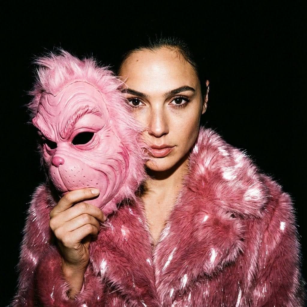 "«Лицо оставить строго без изменений. Ультрареалистичная флеш-фотография в полной темноте. Женщина расположена по центру кадра, съёмка ведётся в абсолютной темноте с прямой вспышкой, направленной из камеры. Вспышка создаёт жёсткий контраст, резкие тени, пересвеченные блики и ощущение сырого, откровенного редакционного кадра. На ней роскошная розовая шуба — плотный, пушистый, насыщенно текстурированный мех. Мех неравномерно отражает свет вспышки, создавая глубину, блеск и хаотичные световые акценты. Она держит рядом с лицом розовую маску в стиле Гринча, частично закрывающую одну сторону лица. Фон: абсолютно чёрный, без видимой среды и без фонового освещения. Настроение: провокационное, декадентское праздничное безумие. Стиль: андеграундная люксовая эстетика, редакционная съёмка со вспышкой, сырой рождественский гламур, ультрафотореализм, резкий фокус, брутальный реализм. Негативный промт: деформированное лицо, изменённая внешность, искажённые черты лица, низкое качество, нереалистичная кожа, нереалистичная модель, нарисованное фото, нереалистичное фото»"