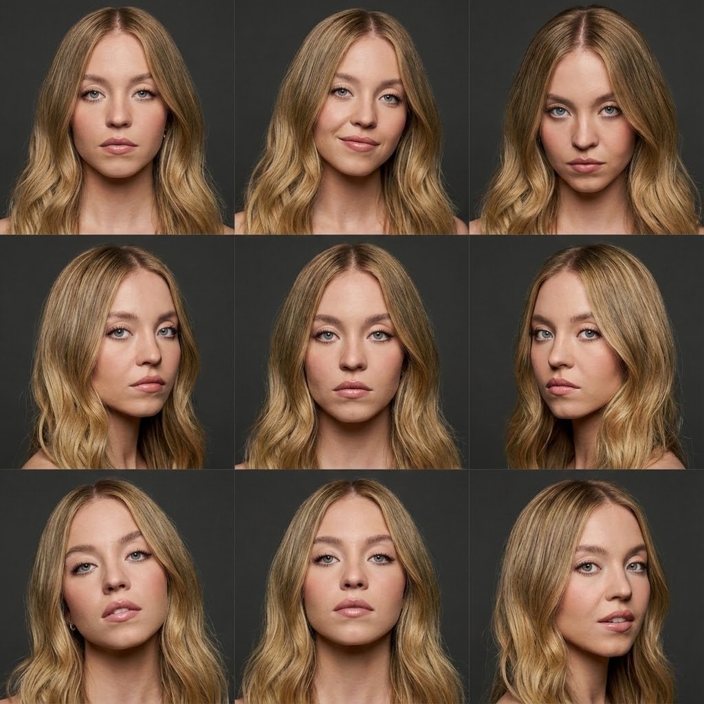 "Основная задача Преобразуй моё исходное фото в ультрареалистичную сетку из 9 изображений (3×3). СТРОГО сохранить внешность 1-в-1 во всех кадрах: лицо, пропорции, природную асимметрию, форму и размер глаз, носа, губ, линию роста волос, текстуру кожи. Исходное фото использовать как эталон идентичности. Без морфинга, усреднения, face swap, изменения возраста или физиологии. Формат и композиция Финальный результат — единое изображение, разбитое на 9 равных кадров (3×3). Во всех кадрах: одинаковый масштаб лица; одинаковая оптика; единый студийный стиль; различия только в позе головы, выражении лица и направлении взгляда. КАДРЫ 3×3 (детально) Кадр 1 (верхний левый) Поза: голова прямо, без наклона Взгляд: прямо в камеру Выражение: нейтральное, спокойное, расслабленные губы Настроение: базовое, «паспортное», чистая идентичность Кадр 2 (верхний центр) Поза: голова слегка наклонена вправо Взгляд: прямо в камеру Выражение: лёгкая, едва заметная улыбка Настроение: мягкое, дружелюбное, естественное Кадр 3 (верхний правый) Поза: голова слегка наклонена влево Взгляд: в камеру из-под бровей Выражение: серьёзное, собранное Настроение: уверенность, внутренняя концентрация Кадр 4 (средний левый) Поза: голова повернута на 10–15° вправо Взгляд: мимо камеры вправо Выражение: задумчивое, губы расслаблены Настроение: интроспекция, спокойствие Кадр 5 (центр сетки) Поза: голова строго прямо Взгляд: прямо в камеру Выражение: максимально нейтральное, без эмоции Настроение: эталонный кадр идентичности (ключевой) Кадр 6 (средний правый) Поза: голова повернута на 10–15° влево Взгляд: мимо камеры влево Выражение: слегка напряжённое, собранное Настроение: внутренняя сила, контроль Кадр 7 (нижний левый) Поза: голова чуть опущена Взгляд: снизу вверх в камеру Выражение: мягко напряжённое Настроение: драматичное, кинематографичное Кадр 8 (нижний центр) Поза: голова слегка откинута назад Взгляд: прямо в камеру Выражение: уверенное, спокойное Настроение: зрелость, стабильность Кадр 9 (нижний правый) Поза: голова повернута в три четверти Взгляд: мимо камеры Выражение: лёгкая полуулыбка Настроение: естественное, живое, не позированное Внешность (общая для всех 9 кадров) Лицо полностью идентично исходному фото. Кожа — естественная, с видимой текстурой и порами. Причёска, макияж (если есть), состояние кожи — одинаковы во всех кадрах. Никаких «разных версий» лица между кадрами. Фон Студийный однотонный фон. Цвет и текстура фона одинаковы для всех 9 изображений. Без объектов и деталей. Свет Студийный мягкий свет. Схема освещения единая для всей сетки. Допускаются минимальные микровариации теней из-за поворота головы. Без пересветов и жёстких провалов. Камера и качество Фотореализм. Портретная оптика (эквивалент 85mm). Резкий фокус по глазам. Высокая детализация, профессиональное качество. Стиль Чистый студийный портрет. Редакционный контакт-лист / модельная компкарта. Акцент на диапазон выражений при абсолютно сохранённой идентичности. Негативный промпт не менять лицо, черты, пропорции и природную асимметрию; без морфинга, усреднения, face swap; без разных «версий» лица между кадрами; без искажений анатомии; без мультяшности, CGI и артефактов; без текста, рамок, логотипов и водяных знаков."