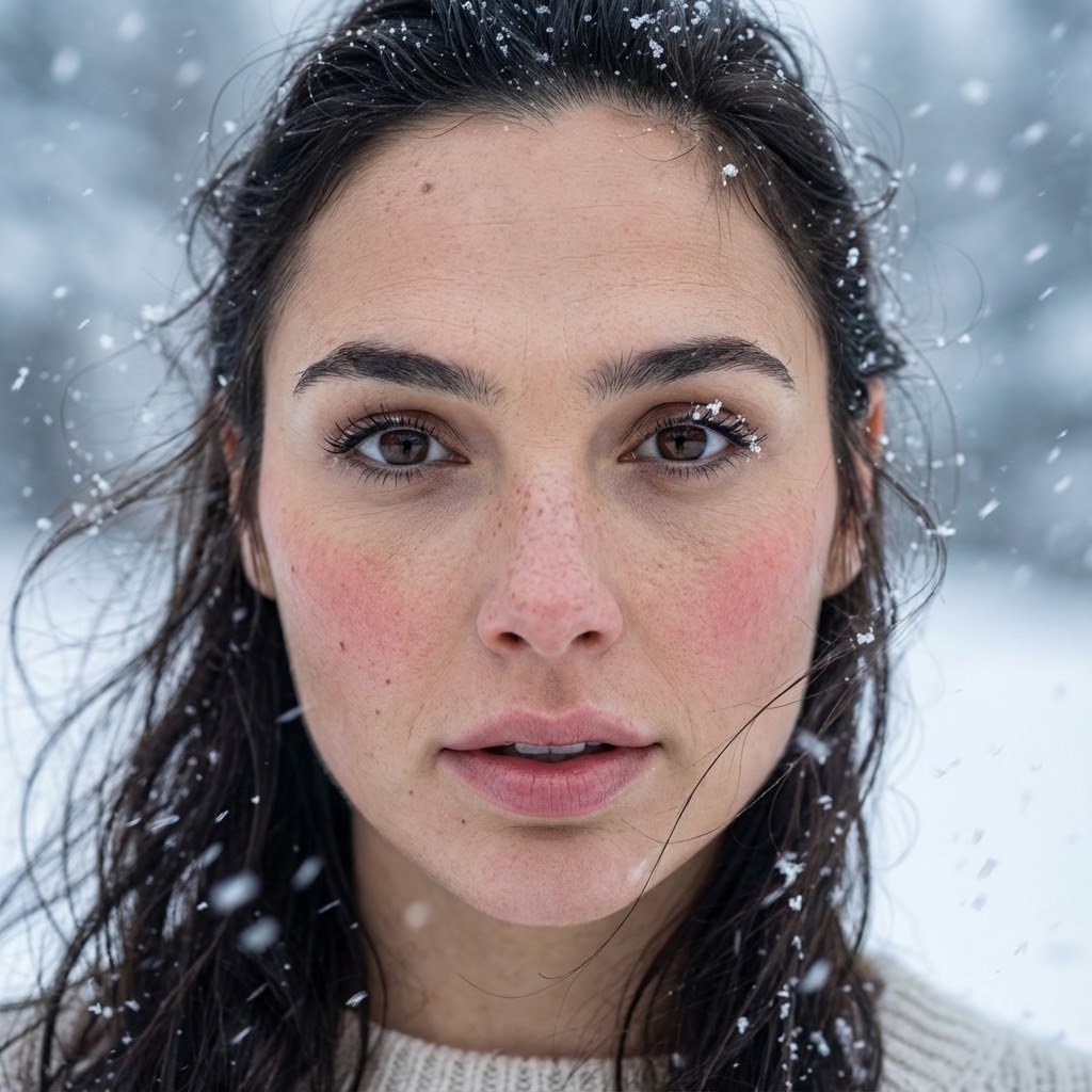 "Высокодетализированная, ультрареалистичная портретная фотография с кинематографической эмоциональностью. Атмосфера — свежая, зимняя, передающая ощущение легкой магии снежной бури и естественной красоты. Изображение должно быть выполнено в сверхвысоком разрешении (8K). Внешность и телосложение Ключевое требование: Внешность девушки должна быть сохранена строго 1 к 1 с предоставленного референсного фото. Ее настоящее лицо, глаза, нос, губы — всё должно быть 100% без изменений. Загруженное фото — единственный эталон внешности. Кожа: Сохранить естественную текстуру кожи, включая поры, веснушки и мелкие детали. На щеках должен быть виден легкий естественный румянец от мороза. На коже и волосах видны тающие снежинки. Выражение лица: Взгляд направлен прямо в камеру. Выражение лица передает легкое удивление и свежесть. Губы слегка приоткрыты. Поза и композиция Кадрирование: Крупный план, портретная фотография. Положение: Девушка стоит лицом к камере. Одежда В нижней части кадра видна часть светлого вязаного свитера. Прическа Волосы развеваются на ветру, создавая ощущение движения от снежного вихря. На волосах видны тающие снежинки и мокрые блики. Фон и окружение Фон: Размытый снежный пейзаж, создающий эффект снежного вихря или метели. Элементы: Вокруг девушки в воздухе летят снежинки. Свет Мягкий, рассеянный зимний свет. Он создает нежные, естественные блики на мокрых от тающего снега волосах, на коже и на отдельных снежинках. Свет должен подчеркивать текстуру кожи, веснушки и поры, не сглаживая их. Цветовая палитра холодная. Камера и эффекты Объектив: Портретный объектив. Фокус: Резкий фокус на лице девушки. Эффекты: Фон размыт (боке), чтобы создать глубину и акцентировать внимание на портрете. Идеальная проработка текстур: тающий снег, мокрые пряди волос, кожа с веснушками и блики света. Негативный промпт Изменение черт лица, face swap, ретушь, пластиковая или сглаженная кожа, отсутствие веснушек/пор, сухие волосы, статичная прическа, ясный день, отсутствие снега, студийный свет, теплые тона, макияж (кроме естественного румянца), мультяшный стиль, рисунок, 3D-рендер, текст, логотипы."