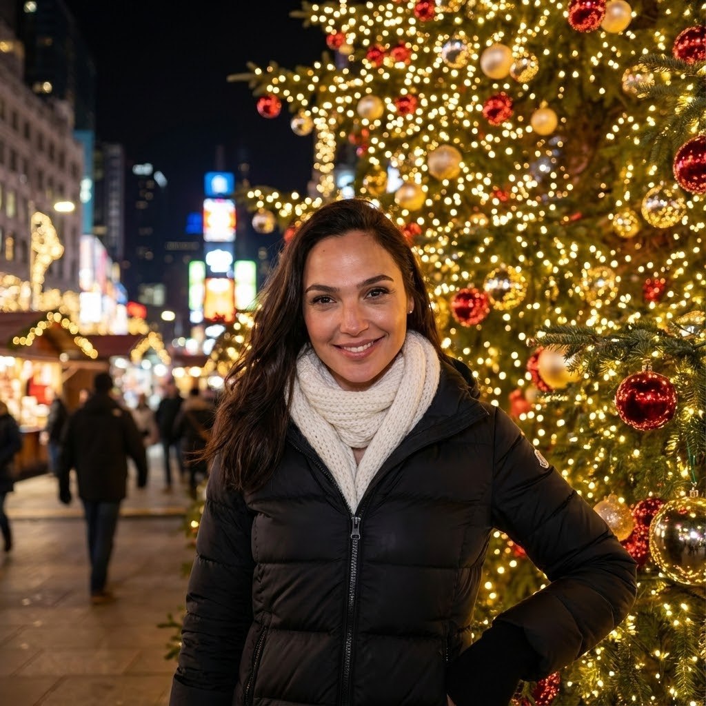 "Стиль и общая концепция Ультрареалистичная ночная фотография в сверхвысоком разрешении (8K), передающая атмосферу праздника на новогодней уличной площади. Эстетика — живая, динамичная, с акцентом на теплый свет гирлянд и ощущение момента. Внешность и телосложение Ключевое требование: Внешность человека должна быть сохранена строго 1 к 1 с предоставленного селфи. Настоящее лицо без любых изменений. Лицо и пропорции: Полностью сохранить форму и пропорции лица, включая глаза, нос и губы. Кожа: Сохранить реальную, естественную текстуру кожи. Выражение лица: Легкая, естественная улыбка. Взгляд направлен прямо в объектив. Поза и композиция Кадрирование: Средний или крупный план. Положение: Человек стоит расслабленно, анфас (лицом к камере). Поза (строго): Одна рука находится в естественном движении (например, согнута в локте), вторая опущена. Одежда Верхняя одежда: Черная пуховая куртка. Аксессуары: Белый вязаный шарф. Прическа Волосы сохранены с референса. Если волосы длинные, они лежат поверх куртки и шарфа. Фон и окружение Расположение: Человек стоит вплотную к огромной, богато украшенной новогодней ёлке. Расстояние между человеком и ёлкой минимальное. Передний/Средний план: Ёлка занимает большую часть кадра. Яркие гирлянды нависают над человеком, создавая эффект светового навеса. Задний план: Размытый фон (боке) с огнями ночного города и силуэтами других людей, что создает ощущение оживленной площади. Свет Основной источник: Теплый, праздничный свет от тысяч ёлочных гирлянд. Эффекты света: Свет создает сильные, яркие блики на лице, на поверхности пуховой куртки и на текстуре вязаного шарфа. Камера и эффекты Объектив: Портретный объектив, хорошо работающий в условиях низкой освещенности. Фокус: Резкий фокус на лице человека. Детализация: Высокая детализация текстур — ткани куртки и шарфа, кожи, отдельных лампочек гирлянд. Негативный промпт Любое изменение черт лица, face swap, ретушь, сглаженная или пластиковая кожа, студийное фото, дневной свет, человек стоит далеко от ёлки, пустая площадь без людей, отсутствие гирлянд, другая одежда, статичная поза, грустное или серьезное выражение лица, мультяшный стиль, рисунок, 3D-рендер, текст, логотипы. При любом конфликте в генерации приоритет — абсолютная идентичность лица с референсом."