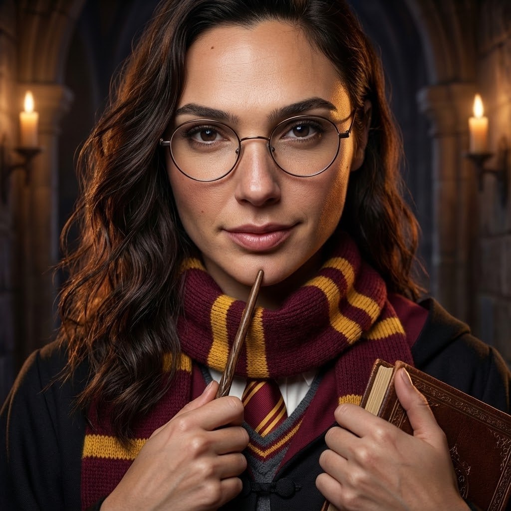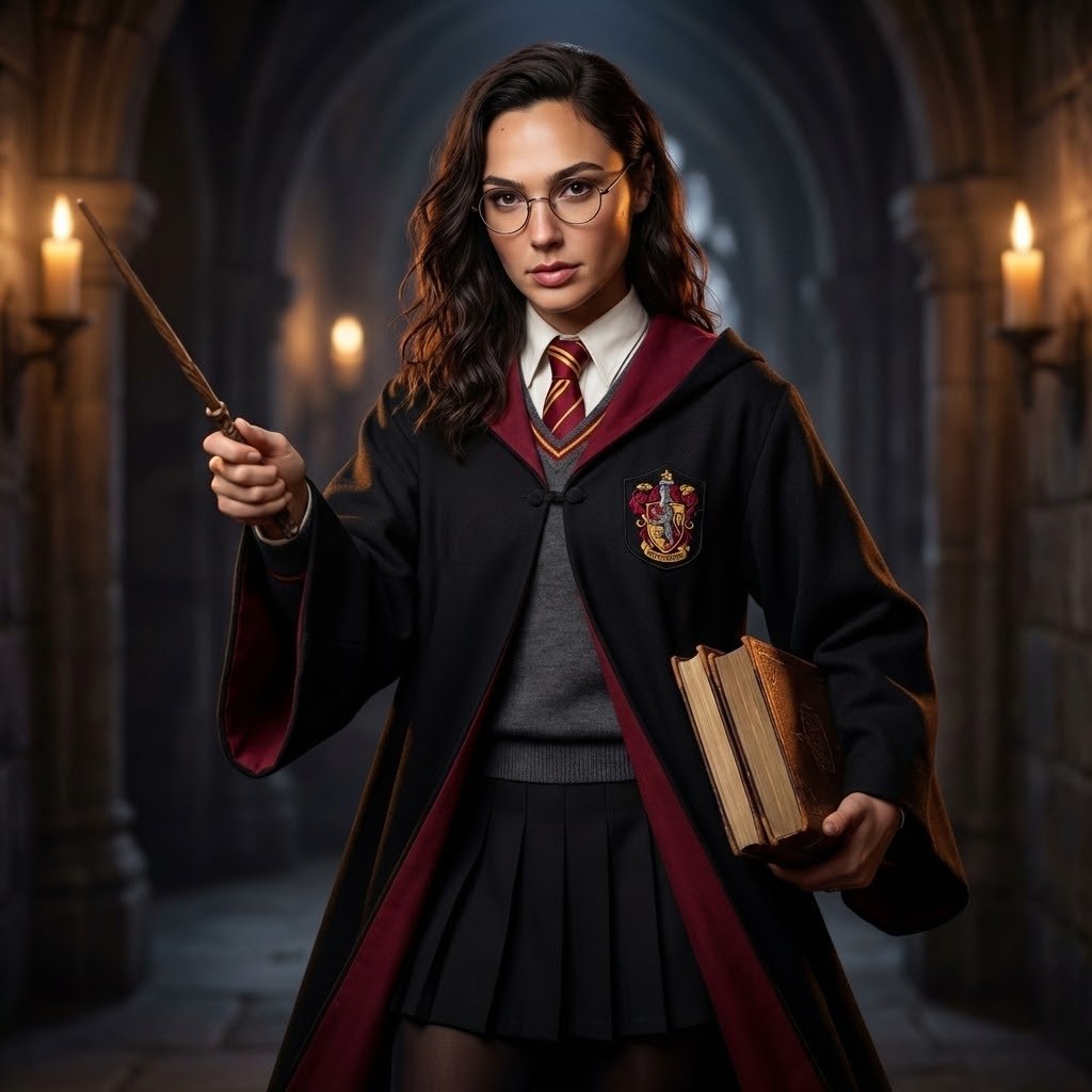 "СТРОГО СОХРАНИ ВНЕШНОСТЬ девушки с прикреплённого фото, 1:1 её настоящее лицо, глаза, нос, кожа с порами, волнистые волосы, пропорции тела — всё 100% без изменений. Используй отправленное фото как эталон. Гиперреалистичная, высокодетализированная студийная фотография в стиле фильмов о Гарри Поттере: молодая волшебница в классической чёрной мантии Хогвартса с бордовой подкладкой и вышитым гербом Гриффиндора, под мантией — белая рубашка, бордово-золотой галстук в полоску, серый свитер, чёрная юбка и чёрные колготки. В одной руке волшебная палочка, направленная вперёд, в другой — стопка книг под мышкой. Поза уверенная и боевая, взгляд серьёзный и сосредоточенный. Тёплый свет свечей замка создаёт драматические блики на палочке, очках, шарфе и мантии, глубокие тени подчёркивают текстуру. Фон — размытый тёмный каменный коридор Хогвартса с арками. Атмосфера магическая, как момент заклинания в дуэли. 8K, идеальные текстуры шерсти шарфа, дерева палочки, вышивки и кожи, кинематографическая интенсивность и магия Хогвартса."