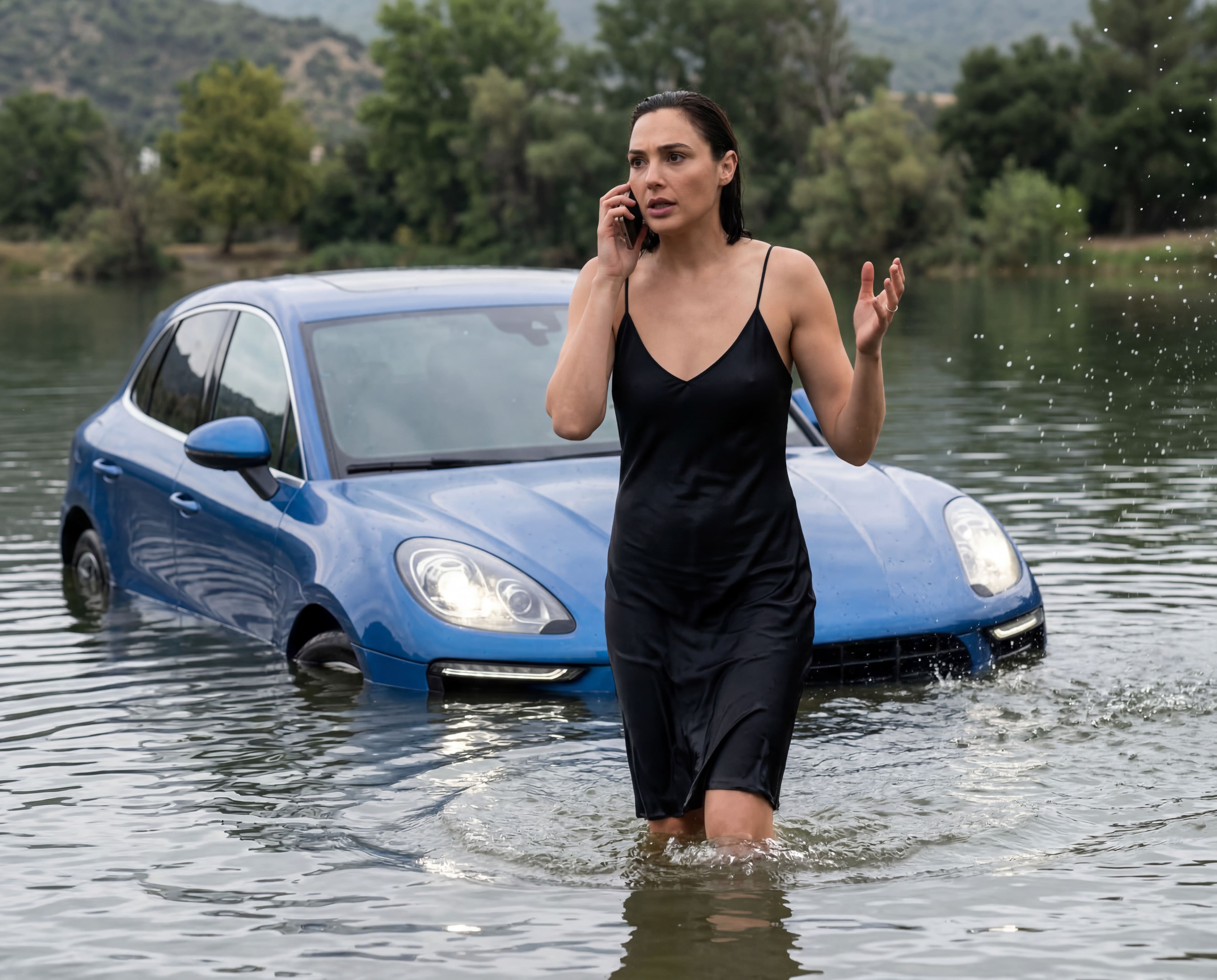 "Сделай фото по моему селфи, сохрани мою естественную внешность и естественную асимметрию лица строго 1-в-1. Без изменения строения лица, сохранить исходное выражение лица, гладкую молодую кожу без возрастной текстуры. Без морфинга, усреднения и face swap, без ретуши. Портрет девушки у тонущей машины в озере: • ОКРУЖЕНИЕ: Автомобиль тонет в озере, дневная съёмка, атмосфера драмы и напряжения, вода тёмная, видны волны и брызги, девушка стоит в воде по колено рядом с машиной, разговаривает по телефону со спасателями • МАШИНА: автомобиль Porsche Macan синего цвета погружён в воду озера, видно фары, видна передняя часть автомобиля, вода покрыла кузов • ПОЗА МОДЕЛИ: Девушка стоит в воде по колено рядом с тонущей машиной, машина наполовину под водой полностью, из-под воды видно капот и фары, одна рука держит телефон у уха (разговор со спасателями), другая рука слегка приподнята в жесте беспокойства, корпус слегка повёрнут к машине • ОДЕЖДА: Тёмное облегающее платье из шелка на лямках, с разрезом, мокрое и прилипает к телу, длинные волосы распущенные по плечам и спине, мокрые пряди • ОСВЕЩЕНИЕ: дневное освещение, кинематографичная атмосфера, дневное пасмурное освещение • РАКУРС И КАДРИРОВАНИЕ: Съёмка спереди, средний план (видна фигура модели по колено в воде и рядом с девушкой тонущая машина), автомобиль под водой, виднеются фары из-под воды, багажник и половина машины полностью под водой, модель рядом с автомобилем, вода видна вокруг Стиль: кинематографичное качество, атмосферное фото, высокое разрешение, детализация, драматичная сцена NEGATIVE: изменение исходной асимметрии лица и изменение исходной внешности, text, logo, watermark, frame, poster design, heavy beauty retouch, plastic skin, oversharpening, Al artifacts, deformed animal, extra limbs, extra fingers, distorted hands, crooked eyes/mouth, dirt/smudges"