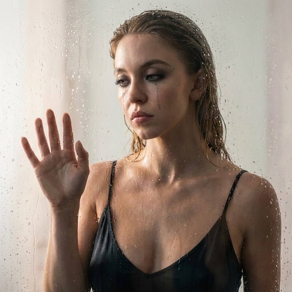 "сделай ультра реалистичное фото по моему селфи, максимально сохраняя мою внешность: мои черты лица, пропорции, природную асимметрию, форму и цвет глаз, бровей и губ, цвет и текстуру кожи, цвет, длину и естественную укладку волос; не меняй мой возраст и телосложение, не искажай форму лица, не улучшай и не ретушируй кожу телосложение: худое, аскетичное, длинные конечности, большая грудь. Поза и композиция: я стою за запотевшим стеклом, полностью покрытым крупными каплями воды, кадр по грудь. корпус чуть развёрнут в три четверти, лицо повернуто в сторону от камеры, подбородок слегка опущен, взгляд опущен или прикрыт, выражение лица драматичное и немного уставшее. одну руку я подношу к стеклу и прижимаю ладонь к нему – пальцы раскрыты, линия кисти красиво читается сквозь капли воды. вторая рука остаётся ниже, не в кадре или лишь намечается. Фон и окружение: за стеклом лёгкий размытый фон светлого цвета, мягкие светлые пятна, никаких читаемых предметов. главное — фактура мокрого стекла с каплями и потёками, между камерой и мной. Свет: мягкий, но контрастный боковой свет, как от окна или лампы сбоку, подчёркивает скулы, нос и линию шеи, даёт блики на мокрой коже и каплях на стекле. часть лица уходит в тень, создавая сильное драматичное настроение, но глаза и профиль хорошо читаются. Одежда: на мне мокрое платье на тонких бретелях из плотной, но слегка струящейся ткани, без прозрачности. вырез аккуратный, без глубокого декольте; платье плотно прилегает к телу сверху, создаёт красивые складки от воды, но не открывает и не подчеркивает ничего лишнего. никаких принтов, именно однотонное тёмное или нейтральное платье, без логотипов. Кожа, волосы, макияж: кожа влажная, с естественными бликами, на плечах и ключицах видны капли воды, местами тонкие потёки. волосы мокрые, гладко зачёсаны назад, отдельные пряди могут прилипать к шее или вискам. макияж смоки с влажным эффектом, немного потёкшая тушь под глазами — тонкие, аккуратные потёки, подчёркивающие эмоцию, но не превращающие кадр в хоррор. текстура кожи остаётся живой, с порами и лёгкими несовершенствами. Камера и объектив: shot on Hasselblad H6D, 100mm f/2.2, малая глубина резкости, стекло с каплями и фон мягко размыты, резкий фокус на моём лице и руке за стеклом, высокая детализация капель, кожи и волос. Стиль и обработка: кинематографичный драматичный портрет, богатые полутени, слегка приглушённая цветовая палитра с тёпло-холодным миксом (тёплая кожа, чуть более холодный фон), чистое изображение без шума и артефактов, ощущение кадра из эмоциональной сцены фильма. Negative prompt: изменение черт лица, фигуры, пропорций тела и возраста, выравнивание моей природной асимметрии, пластиковая переретушированная кожа, сухие аккуратно уложенные волосы, отсутствие капель воды на стекле и коже, яркий глянцевый макияж без потёков, слишком глубокое декольте или прозрачная ткань, открытая грудь, отсутствие стекла между мной и камерой, простой сухой фон без воды и фактуры, предметы интерьера на фоне, кислотные цвета, мультяшный или 3D-стиль, текст, логотипы и надписи, водяные знаки, цифровые артефакты, сильный смаз лица, низкое разрешение, пересвеченные участки и провалы в тени."