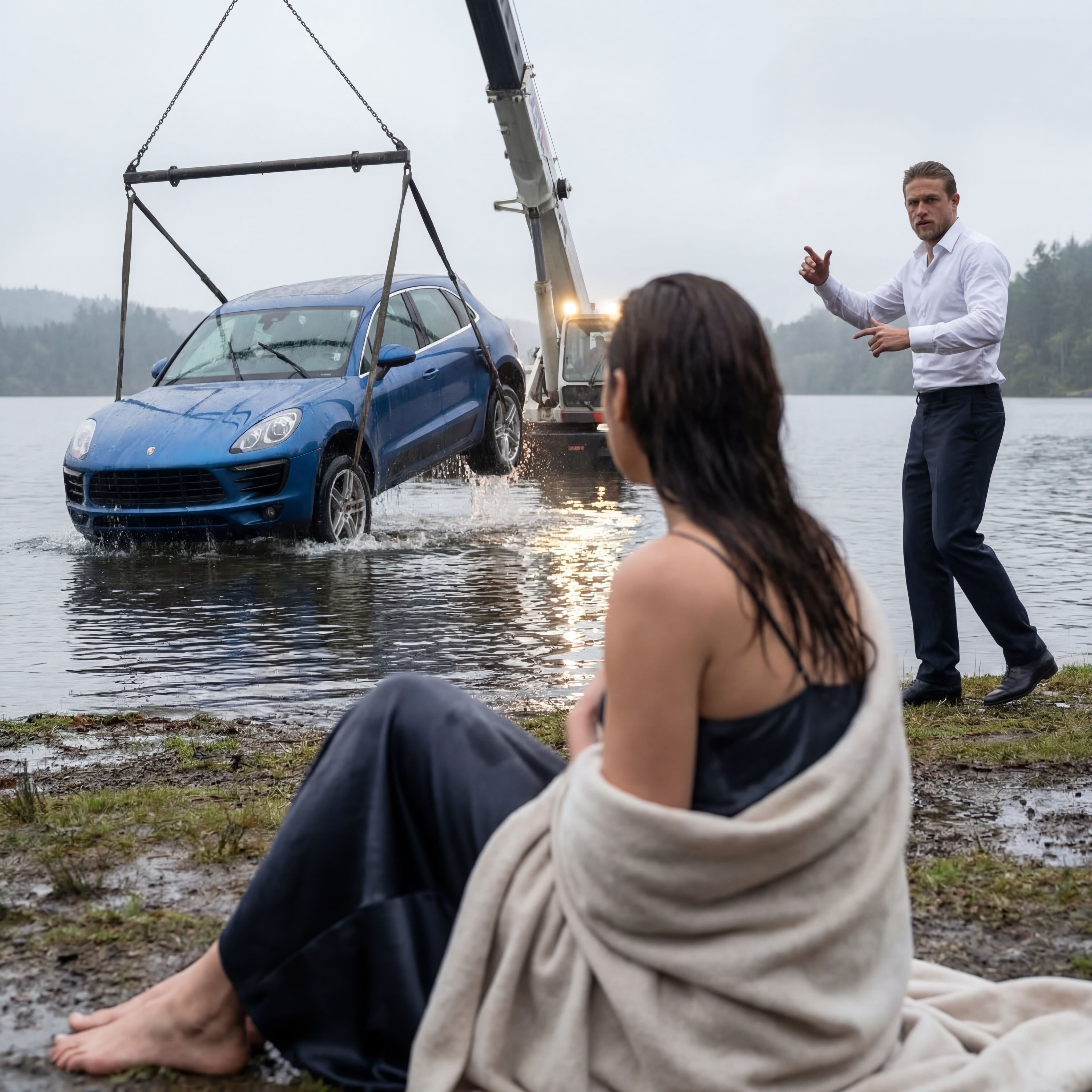 "Сделай реалистичное фото по двум исходным фото (селфи женщины и селфи мужчины). Сохрани внешность мужчины строго 1-в-1 по исходному фото, сохрани природную асимметрию лица, форму глаз, губ, носа и линию подбородка. Ничего не менять в лице, без ретуши и любых улучшений. Сохрани внешность женщины строго 1-в-1 по исходному фото, сохранить природную асимметрию лица и естественные черты. Телосложение: Мужчина - рост 178 см, обычное крепкое телосложение, естественные пропорции тела. Женщина — рост 178 см, худое аскетичное телосложение, длинные конечности. Девушка после эвакуации машины из озера: • ОКРУЖЕНИЕ: Девушка сидит на земле спиной к камере, немного в стороне от места происшествия, мокрая, слегка закутана в плед, на заднем плане немного дальше виден мужчина (её муж), который руководит работой крана, вытаскивающего машину из озера, дневная съемка, атмосфера напряжения • МАШИНА: автомобиль Porsche Macan синего цвета вытаскивают из озера с помощью крана, автомобиль частично в воде, видны брызги воды, кран поднимает машину • ПОЗА МОДЕЛИ: Девушка сидит прямо на земле, спиной к камере, гордо выпрямив спину, закутана в плед, мокрые волосы, слегка размыта (не в фокусе) • МУЖ НА ЗАДНЕМ ПЛАНЕ: Мужчина стоит дальше от девушки, руководит операцией по извлечению машины краном, показывает жесты оператору крана, фигура в фокусе Муж одет в классические брюки, и белую рубашку. • ОДЕЖДА: Тёмное шелковое платье на лямках с открытыми руками, девушка закутана в светлый плед/одеяло, мокрые длинные волосы распущенные по плечам и спине • ОСВЕЩЕНИЕ: дневное пасмурное освещение, кинематографичная атмосфера, свет прожекторов крана создаёт контрастные блики на воде, мягкие тени, • РАКУРС И КАДРИРОВАНИЕ: Съёмка сзади, девушка на переднем плане слегка размыта (не в фокусе), средний план, на заднем плане в фокусе муж и кран с машиной, глубина резкости Стиль: кинематографичное качество, атмосферное фото, высокое разрешение, детализация, драматичная сцена Негативный промпт изменение внешности мужчины или женщины, изменение природной асимметрии лица, face swap, морфинг лица, ретушь кожи, пластиковая кожа, мешки, темные круги и синяки под глазами, морщины, изменение возраста, изменение пропорций тела, деформация тела, лишние конечности, CG, 3D, аниме, иллюстрация, размытые лица, низкое качество, артефакты."