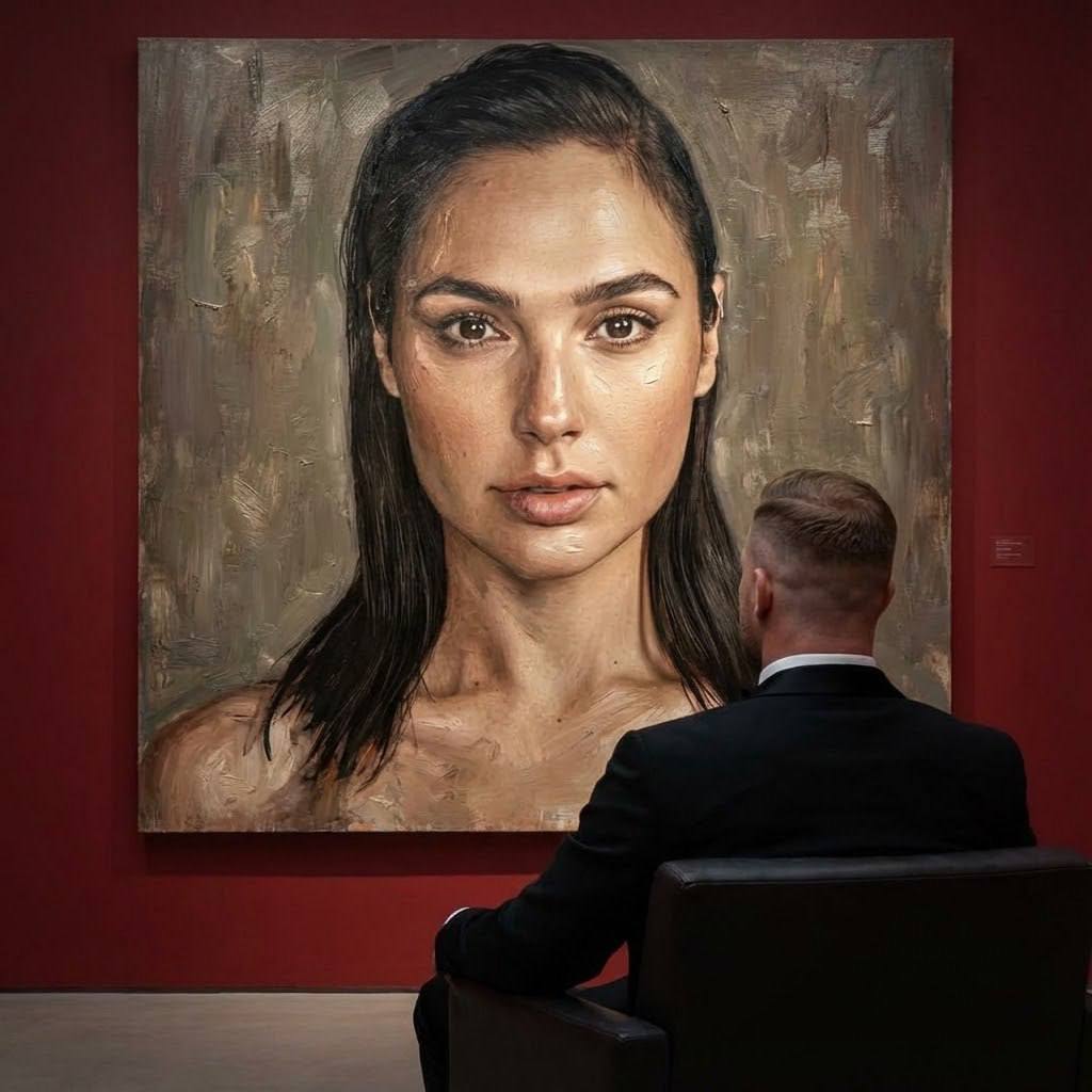 Создайте сцену в галерее современного искусства, используя прилагаемое изображение лица и внешности девушки, не меняя её черты лица и тела. На стене висит очень большая картина с изображением девушки, которая на фото, картина нарисованная маслом. Ее лицо и тело написаны в реалистичной, экспрессивной манере масляной живописи с текстурированными мазками и приглушёнными цветами. Чистая красная стена галереи создаёт профессиональную атмосферу выставки благодаря мягкому освещению, освещающему произведение искусства. В кресле сидит спиной мужчина не тощего телосложения в черном смокинге, светло русыми короткими волосами, с боков волосы коротко сбриты, волос на бороде нет и рассматривает картину кинематографическое и таинственное настроение.
