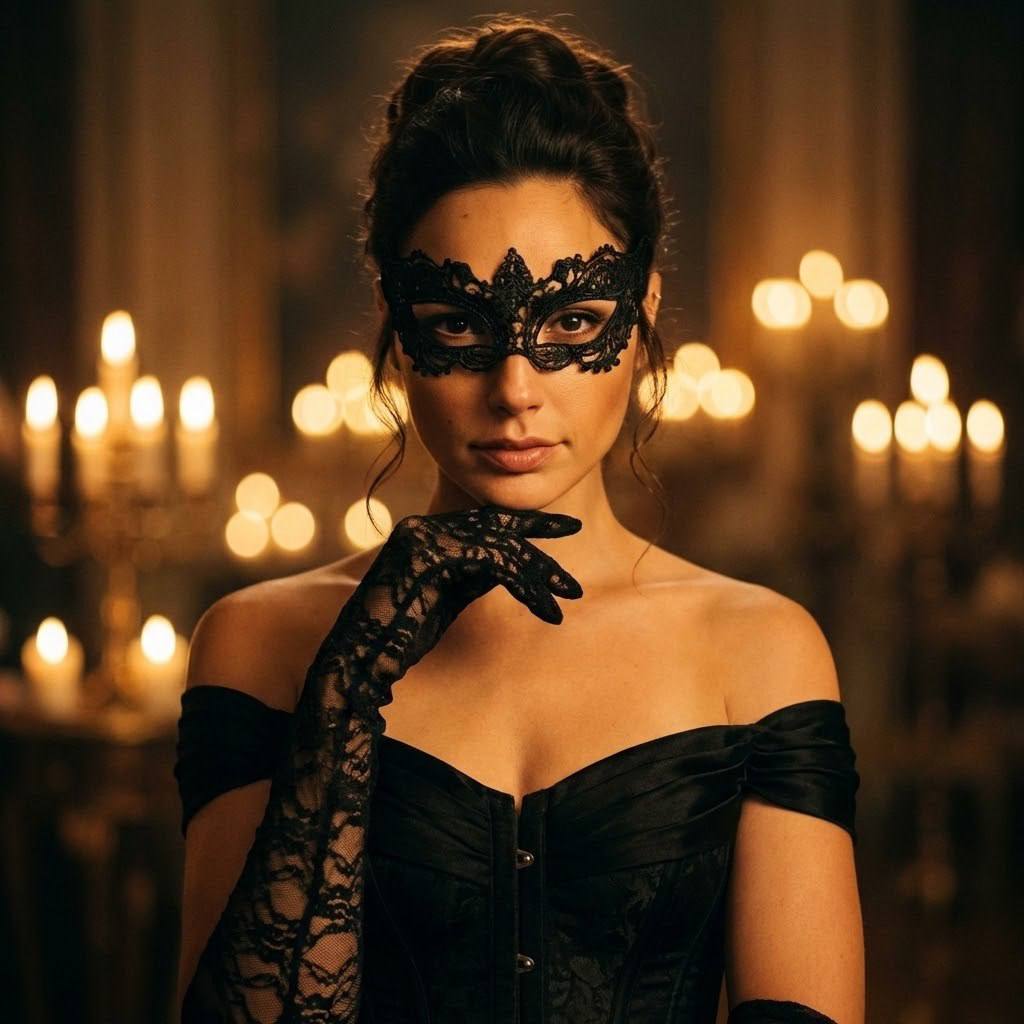 "Лицо оставить строго без изменений. Элегантная вечерняя фотосессия в стиле mysterious masquerade, dark luxury, cinematic portrait, gothic glamour. Атмосфера тайного аристократического бала при свечах, ощущение интриги, утончённости и кинематографической драмы. Поза модели Модель стоит неподвижно, корпус развёрнут прямо к камере. Одна рука в чёрной кружевной перчатке приподнята к подбородку, пальцы изящно согнуты, создавая жест задумчивости и скрытой силы. Плечи слегка опущены, ключицы подчёркнуты. Голова расположена ровно, взгляд направлен прямо в объектив. Образ модели Причёска — собранные волосы, аккуратная, но не строгая укладка с мягкими выбившимися прядями. Аксессуар — чёрная ажурная маска из кружева с мелким блеском, плотно повторяющая форму лица, подчёркивающая глаза. Длинные серьги с тёмными камнями. Наряд — чёрное вечернее платье с открытыми плечами, корсетной линией и фактурной тканью. Длинные чёрные кружевные перчатки создают образ роковой аристократки. Атмосфера Полумрак, наполненный тёплым свечным светом. На фоне — множество зажжённых свечей, создающих золотистое боке и ощущение старинного дворца или закрытого бала. Атмосфера загадки, роскоши и запретной элегантности. Ракурс и композиция Крупный портрет по грудь. Камера расположена на уровне глаз модели. Симметричная композиция с акцентом на лицо и маску. Фон полностью размытый, свечи превращаются в мягкие световые круги. Освещение Мягкий направленный свет спереди и немного сбоку, подчёркивающий черты лица и текстуру маски. Тёплый контровой свет от свечей создаёт сияющий ореол и глубину кадра. Тени мягкие, без жёсткого контраста. Обработка фотографии Кинематографическая цветокоррекция: тёплые золотые оттенки на фоне, глубокие чёрные и насыщенные тени в одежде. Высокая детализация лица. Эффекты камеры Объектив 105 mm. Диафрагма f/1.8–f/2.0 для сильного боке. Чёткий фокус на глазах. Лёгкая плёночная зернистость для атмосферности и ощущения luxury cinema. Негативный промт: деформированное лицо, изменённая внешность, искажённые черты лица, низкое качество, нереалистичная кожа, нереалистичная модель, нарисованное фото, нереалистичное фото."