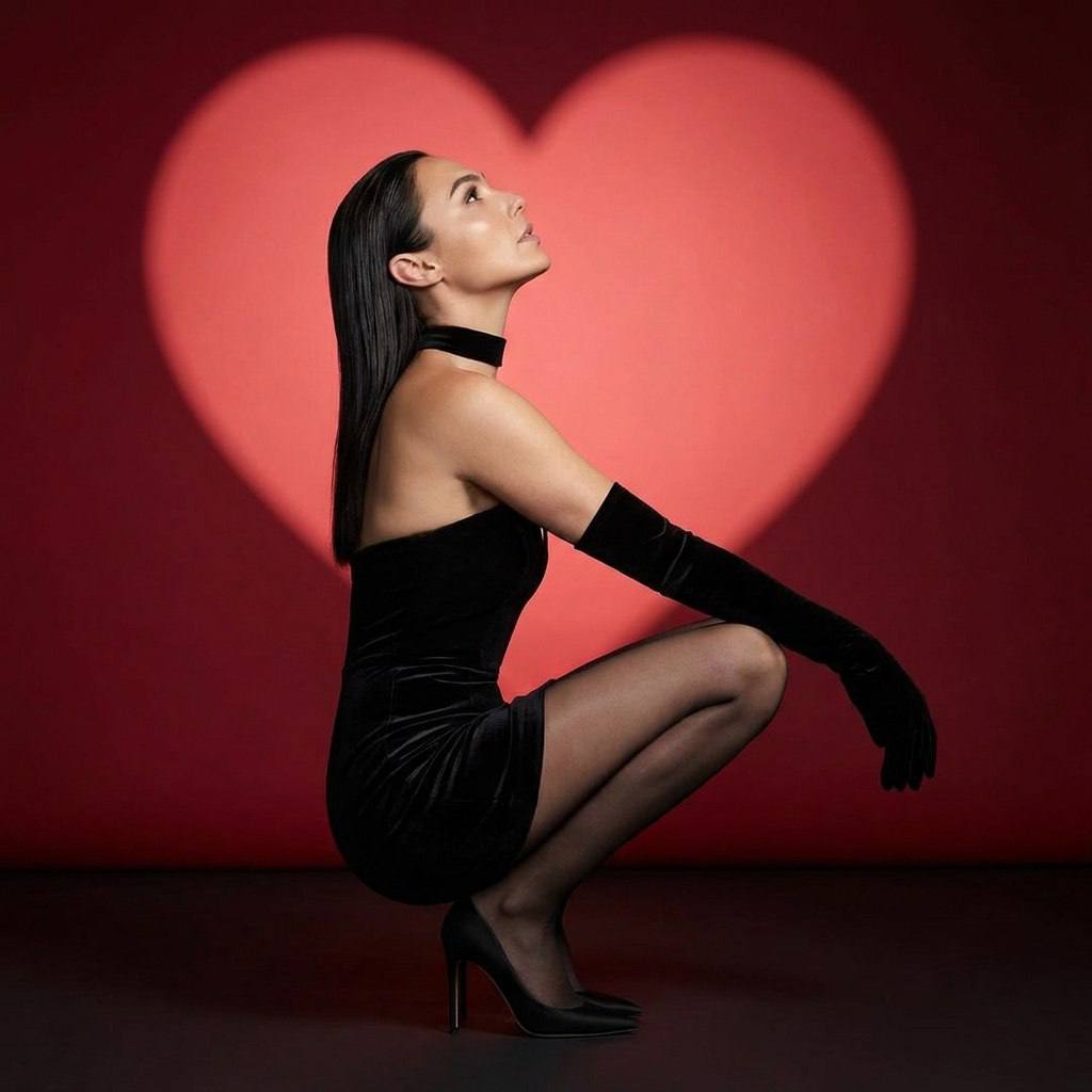 " СОХРАНИТЬ РЕАЛЬНОЕ ЛИЦО — строго сохранить точные черты лица и идентичность с референсного изображения. Без бьютификации, без стилизации. Образ модели: Женщина с прямыми, идеально гладкими волосами. Одета в черное бархатное мини-платье без бретелек (бандо). На руках длинные черные бархатные перчатки выше локтя. На ногах черные полупрозрачные колготки и классические туфли на шпильке. На шее тонкий черный чокер. Поза: Модель сидит на корточках в пол-оборота. Спина прямая, руки расслабленно лежат на коленях поверх бедер. Голова приподнята, взгляд устремлен вверх. Атмосфера: Студийная романтика, минималистичный фэшн, эстетика Дня святого Валентина. Лаконичность, элегантность и чувственность. Освещение: Студийное. Главный акцент — проекция света в форме большого сердца на темно-красном фоне позади модели. Мягкий фронтальный свет освещает лицо и фигуру, создавая объем. Ракурс и композиция: Ракурс сбоку, камера на уровне глаз сидящей модели. Модель расположена по центру на фоне светового сердца. Эффекты фотографии и камеры: Высокое качество цифровой фотографии, студийная резкость. Насыщенная бордово-красная палитра. Чистое изображение без зерна, акцент на текстуре бархата и кожи. Негативный промт: деформированное лицо, изменённая внешность, искажённые черты лица, низкое качество, нереалистичная кожа, нереалистичная модель, нарисованное фото, нереалистичное фото."