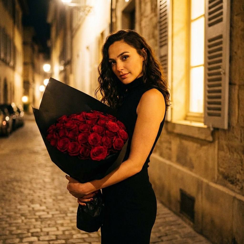 "СОХРАНИТЬ РЕАЛЬНОЕ ЛИЦО — строго сохранить точные черты лица и идентичность с референсного изображения. Без бьютификации, без стилизации. Ночная уличная fashion-фотосессия в стиле «romantic night luxury» с атмосферой свидания и эстетикой элегантной вечерней прогулки по городу. Локация — узкая европейская улица с окнами, ставнями и тёплым светом из интерьеров, создающим уютный и интимный антураж. В кадре ощущение роскоши, романтики и мягкой загадочности ночи. Поза модели Модель стоит вполоборота к камере рядом со стеной здания. Корпус слегка наклонён вперёд к букету. Обе руки держат большой букет роз на уровне живота. Голова повернута в сторону камеры, взгляд направлен в камеру. Плечи расслаблены, спина ровная. Поза спокойная, утончённая и созерцательная, подчёркивающая линию шеи, талию и рук. Образ модели Волнистые распущенные волосы, уложенные крупными мягкими локонами и спадающие на плечо. Наряд — чёрное облегающее платье без рукавов с высокой горловиной, подчёркивающее фигуру. В руках — большой букет красных роз, завернутый в чёрную матовую упаковку. Образ — элегантная женщина после романтического вечера. Атмосфера Романтичная, тёплая и немного кинематографичная. Настроение — тишина ночного города, ощущение свидания и дорогого подарка. Тёплый свет из окон создаёт золотистые блики на волосах и коже, контрастируя с тёмным фоном улицы и чёрным платьем. Ракурс и композиция Средний план по бёдра. Камера расположена на уровне груди модели, под небольшим углом сбоку. Модель смещена к правой части кадра, слева — стена с окнами и ставнями, уходящими в перспективу. Букет занимает центральную часть композиции и является визуальным акцентом. Фон слегка размытый. Обработка фотографии Тёплая ночная цветокоррекция с преобладанием золотистых и глубоких тёмных оттенков. Повышенная чёткость на лице и цветах. Кожа естественная, без пластиковой ретуши. Эффекты камеры Объектив 85 mm. Диафрагма f/1.8 – f/2.5 для мягкого боке фона. Использование вспышки или мягкого направленного света спереди для подсветки модели и букета, комбинированного с тёплым уличным освещением. Лёгкое плёночное зерно для эффекта lifestyle-фотографии и кинематографичности. Негативный промт: деформированное лицо, изменённая внешность, искажённые черты лица, низкое качество, нереалистичная кожа, нереалистичная модель, нарисованное фото, нереалистичное фото."