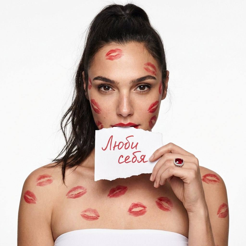 " СОХРАНИТЬ РЕАЛЬНОЕ ЛИЦО — строго сохранить точные черты лица и идентичность с референсного изображения. Без бьютификации, без стилизации. Портретная фотосессия в студии с драматичной, провокационной атмосферой. Минималистичный белый фон без текстур и деталей, создающий ощущение чистоты и пустоты, контрастирующее с эмоциональным образом модели. Визуальный акцент на лице, взгляде и символических деталях — следах поцелуев и надписи. Поза модели Модель стоит фронтально, корпус и плечи направлены строго к камере. Голова расположена ровно, без наклона. Взгляд направлен точно в объектив. Одна рука поднята к лицу — модель держит перед губами лист белой бумаги, слегка неровный, как будто вырванный. Пальцы сжаты уверенно, жест контролируемый. Поза статичная. Образ модели Волосы собраны в высокий хвост с объёмом у корней, отдельные пряди свободно обрамляют лицо. На лице, шее и плечах — хаотичные отпечатки поцелуев красной помадой. На модели белый топ бандо без лямок. Плечи и зона декольте полностью оголенные. Украшение — крупное кольцо с большим красным камнем. Образ — эмоциональный, дерзкий, чувственный. Атмосфера Напряжённая, откровенная, драматичная. В кадре ощущается конфликт между внешней красотой и внутренним посланием. Настроение — вызов, сила, самоидентичность, эмоциональная открытость. Никакой мягкости или романтизации, только честная визуальная прямота. Ракурс и композиция Крупный портретный план — от плеч и выше. Камера расположена строго на уровне глаз. Лицо занимает центральную часть кадра. Бумага с красной надписью «Люби себя» частично перекрывает нижнюю часть лица, усиливая драму и фокус на глазах. Композиция симметричная, минималистичная, без смещения центра. Обработка фотографии Чистая студийная цветокоррекция с нейтральным балансом белого. Высокая чёткость деталей лица. Контраст умеренный, акцент на текстуре кожи, губ, следах помады. Фон абсолютно белый, без градиентов и шумов. Кожа естественная, без глянцевой ретуши. Эффекты камеры Объектив 85 mm. Диафрагма f/2.0 – f/2.8. Профессиональный студийный свет: мягкий фронтальный источник + лёгкий заполняющий свет для минимизации жёстких теней. Равномерное освещение лица, без пересветов. Максимальная резкость в зоне глаз. Негативный промт: деформированное лицо, изменённая внешность, искажённые черты лица, низкое качество, нереалистичная кожа, нереалистичная модель, нарисованное фото, нереалистичное фото."