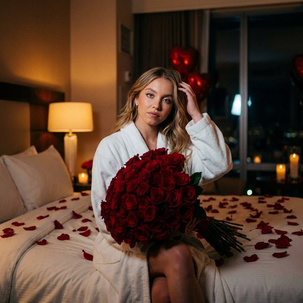 " Фотореалистичный ночной кадр в гостиничном номере: женщина сидит на кровати среди лепестков роз, в руках большой букет алых роз. За окном — ночь, в комнате полумрак. Она слегка наклонила голову, одной рукой касается волос,Кадр выглядит как пойманная пауза позднего вечера. Внешность Сохранение внешности: природная асимметрия лица, черты лица без изменений, сохранить исходный макияж Телосложение и пропорции Худое, аскетичное телосложение, длинные конечности, рост 178 см. Пропорции естественные, без искажений. Одежда и аксессуары Белый махровый халат, свободно сидящий на теле. Открытые ноги, минимум аксессуаров. В руках — объёмный букет тёмно-красных роз с насыщенной фактурой лепестков. Окружение и фон Современный гостиничный номер ночью: мягкое изголовье кровати, белое постельное бельё, лепестки роз на простыне. В фоне — приглушённый свет настенных ламп, возможны свечи, красные шары в форме сердца едва читаются в полумраке. Свет Ночной кинематографичный свет: основной источник — тёплый рассеянный свет от ламп и свечей, слабый холодный контровой свет от окна для отделения силуэта. Мягкие тени, глубокие полутона, эффект свечения кожи без жёсткого контраста. Камера и оптика Full-frame camera, 50–85mm, f/1.8–2.0. Малая глубина резкости, фокус на лице и букете, фон растворяется в мягком ночном боке. Перспектива естественная. Цветокоррекция и стиль Фотореализм с ночной cinematic-подачей. Тёплые янтарные оттенки света, глубокий бордовый цвет роз, мягкий контраст, высокий динамический диапазон, лёгкое плёночное зерно. Негативный промпт аниме, иллюстрация, CGI, 3D, пластик, глянец кожи, ретушь, изменение внешности, морфинг, wide-angle искажения, пересвет, жёсткие тени, дешёвая постановка"